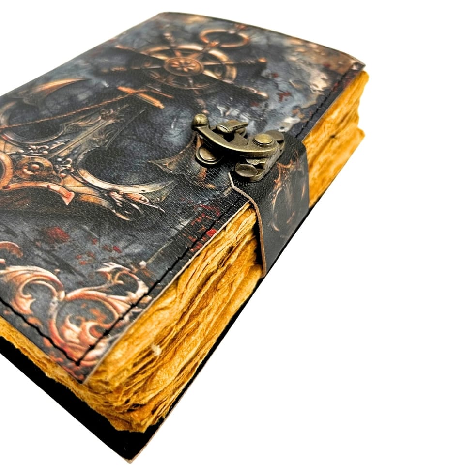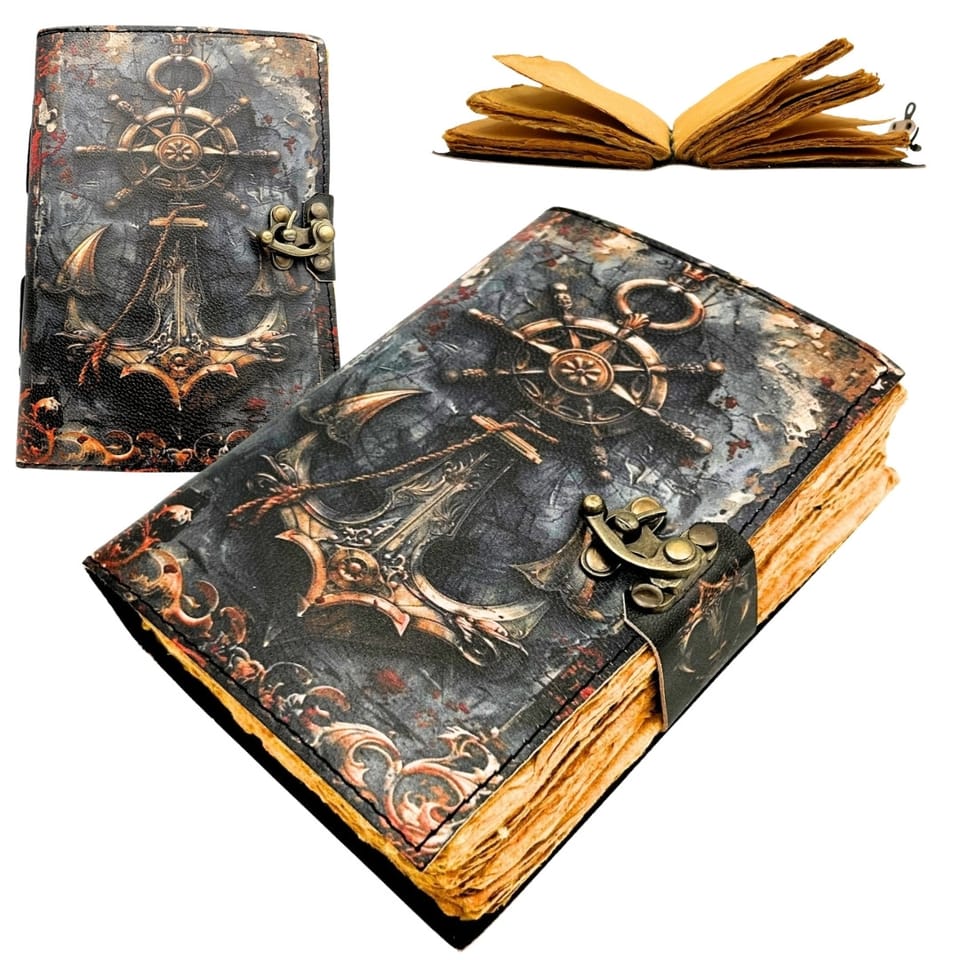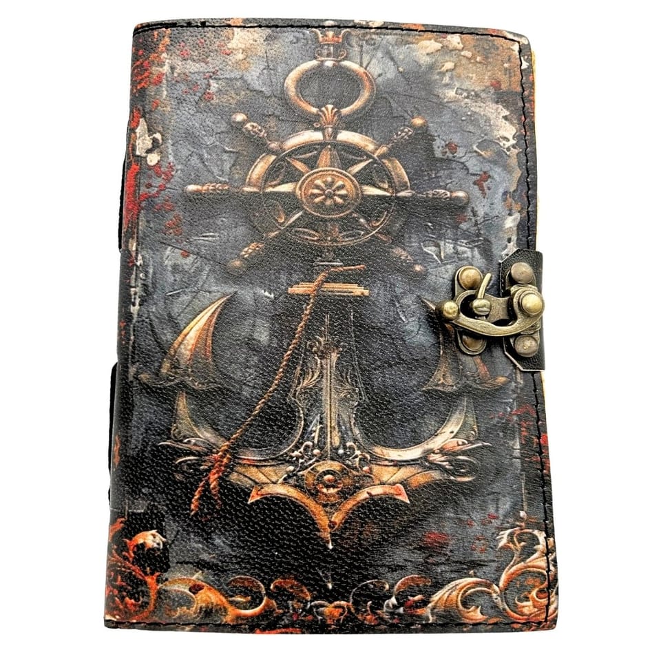 Notes Skórzany Retro Marynistyczny 200 stron - H110 Okładka wykonana z naturalnej skóry koziej. Centralne miejsce zajmują wypukłe tłoczenia kotwicy i steru. Wysokiej jakości papier - Grubszy niż standardowy papier biurowy – idealny do pisania piórem, długopisem czy ołówkiem bez przebijania. Idealny na prezent – dla artystów, pisarzy, podróżników, studentów i każdego, kto ceni rzeczy z duszą. Wykonany z trwałej, eleganckiej koziej skóry, nasz notatnik nie tylko wygląda stylowo, ale jest również odporny na codzienne zużycie, co gwarantuje długą żywotność. Informacje o produkcie: ?Materiał okładki: Skóra kozia (elastyczna i trwała) ?Wymiary: 18 x 13 cm ?Rodzaj papieru: 150 GSM – papier o wysokiej gęstości, stylizowany na retro (kolor vintage) ?Liczba stron: 200 stron ?Zapięcie: Metalowe, w kolorze antycznego mosiądzu (C-hook) ?Styl: Marynistyczny, Vintage, Retro Idealnie sprawdzi się jako: ?Dziennik pokładowy dla miłośników żeglarstwa. ?Ekskluzywny notatnik na codzienne zapiski lub złote myśli. ?Planer podróży, w którym można wklejać bilety i pamiątki. ?Stylowy element dekoracyjny na biurko lub regał z książkami. Dlaczego warto? ?Wysoka jakość materiałów: Skóra kozia zapewnia szlachetny wygląd i przyjemną fakturę, przy jednoczesnej dużej wytrzymałości. ?Papier dla profesjonalistów: Wysoka gramatura 150 GSM gwarantuje, że notatnik sprawdzi się przy różnych technikach pisania i rysowania. ?Trwałe zapięcie: Mechaniczny zatrzask jest nie tylko estetyczny, ale bardzo praktyczny w codziennym użytkowaniu.