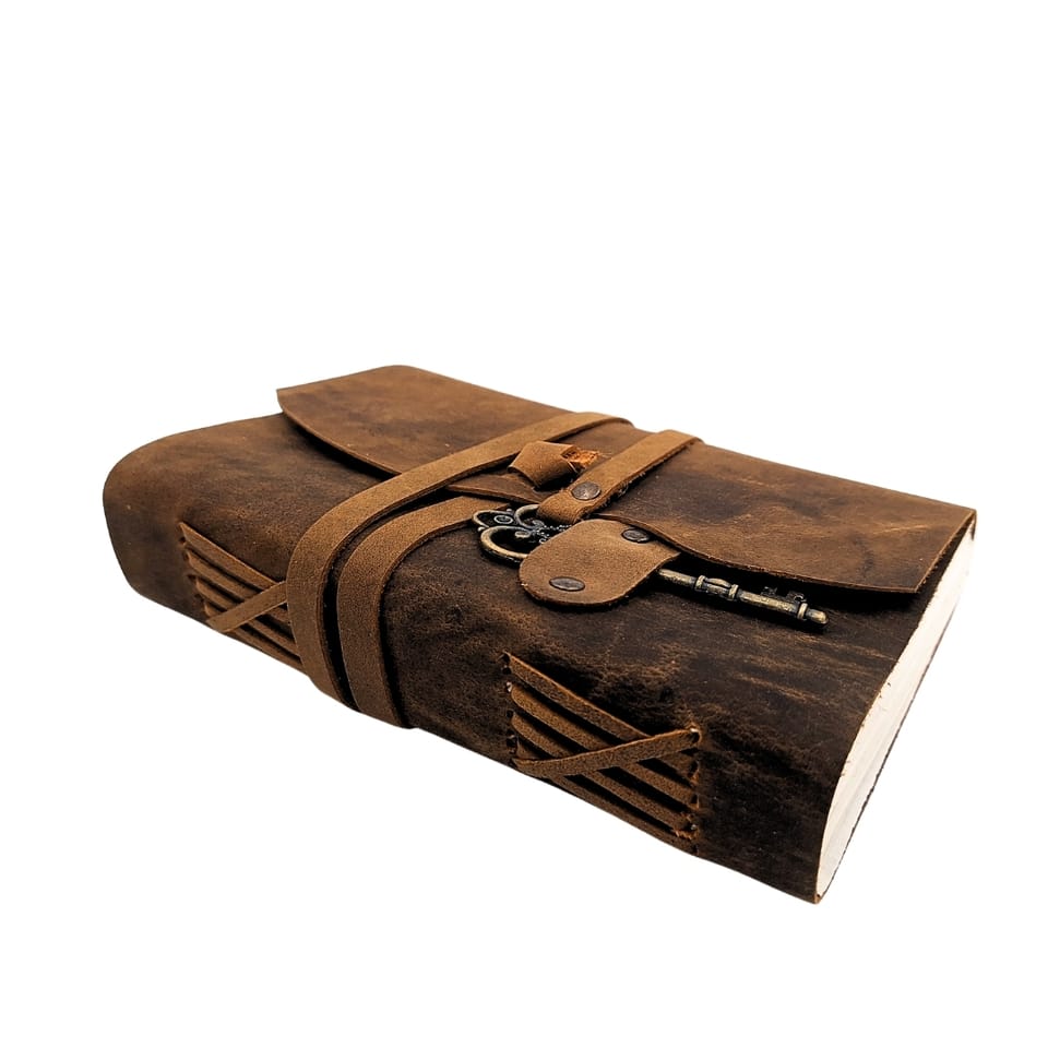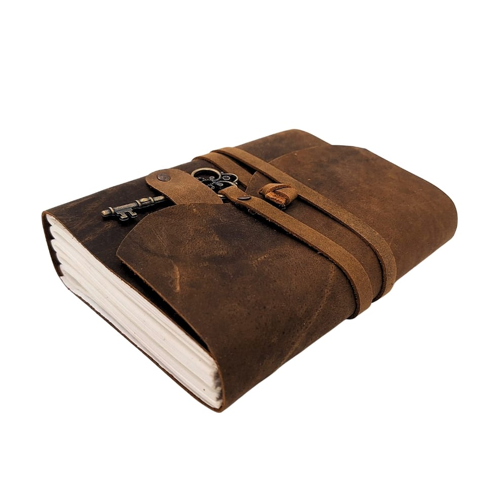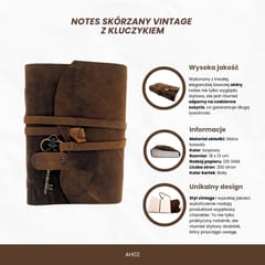 Notes Skórzany Retro z Kluczykiem i Paskiem 200 stron 18 x 13 cm – AH02 Notes Skórzany Vintage z Kluczykiem – elegancki notatnik w stylu retro dla tych, którzy cenią prywatność, estetykę i jakość premium. Elegancki design z funkcjonalnym zamknięciem – stylowy pasek i metalowy kluczyk dodają tajemniczości i zapewniają dyskrecję. Idealny na dziennik, pamiętnik lub osobiste zapiski. Okładka z prawdziwej skóry bawolej w odcieniu głębokiego brązu. To surowiec klasy premium – gruby, wytrzymały i efektowny. Autentyczny styl vintage: postarzane wykończenia, naturalna faktura skóry i detale wykonane z dbałością. Doskonały wybór dla fanów stylu boho, podróżników, pisarzy i miłośników papieru. Grubszy papier 125 gsm – komfort pisania: Wyraźnie lepszy od zwykłego papieru – biały, gładki, nieprzebijający. Odpowiedni dla pióra, cienkopisu czy ołówka. Doskonały pomysł na prezent – dla każdego, kto prowadzi dziennik, podróżuje, szkicuje lub po prostu lubi piękne przedmioty z duszą. Informacje o produkcie: • Materiał okładki: Skóra bawola • Kolor: brązowy • Rozmiar: 18 x 13 cm • Rodzaj papieru: 125 GSM - Papier o gramaturze 125 gsm (gramów na metr kwadratowy) to lekki, ale wyraźnie sztywniejszy od zwykłego papieru biurowego (który zazwyczaj ma 80 gsm). • Liczba stron: 200 stron • Kolor kartek: Biały • Zamknięcie: pasek z kluczykiem • Wysoka jakość wykonania • Styl retro Wysoka jakość materiałów: Wykonany z trwałej, eleganckiej bawolej skóry, notatnik nie tylko wygląda stylowo, ale jest również odporny na codzienne zużycie, co gwarantuje dłuższą żywotność w porównaniu do tanich alternatyw, które szybko się niszczą. Unikalny design: Styl vintage i wysokiej jakości wykończenia nadają produktowi wyjątkowy charakter. To nie tylko praktyczny notatnik, ale również stylowy dodatek, który przyciąga uwagę. Dbałość o szczegóły: Nasz notatnik jest starannie wykonany, co zapewnia nie tylko elegancki wygląd, ale także wygodę użytkowania i trwałość.