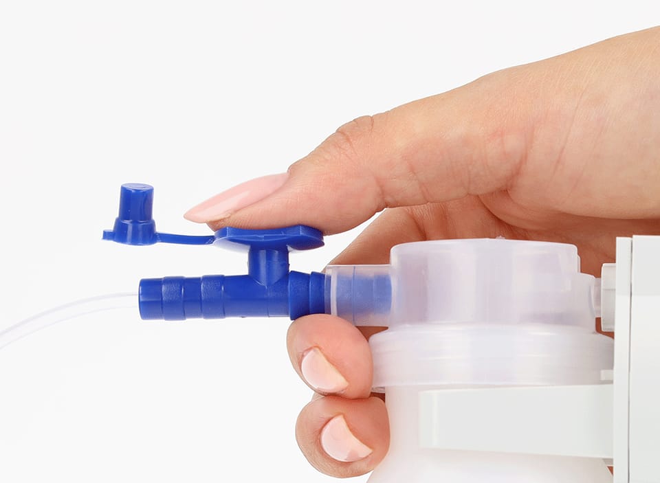 Novama Expert ESUX wyposażony jest w przezroczysty pojemnik o pojemności 1000 ml. Jego konstrukcja umożliwia łatwą kontrolę ilości zassanych płynów, a także szybkie i wygodne wyjęcie w celu opróżnienia. Pojemnik może być sterylizowany, co ułatwia zachowanie wysokiego poziomu higieny i zapewnia wielorazowość. Dodatkowym zabezpieczeniem jest pokrywa z wbudowanym zaworem przelewowym, który chroni pompę ssaka przed zalaniem w przypadku przepełnienia zbiornika.