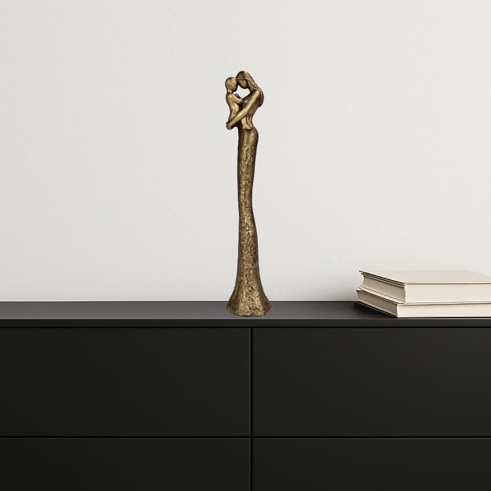 Nowoczesna Figurka Matka z dzieckiem - Symbol rodziny Wysokość 27 cm - E43586 Piękna, elegancka figurka przedstawiająca matkę trzymającą dziecko – ponadczasowy symbol miłości i rodziny. Wykonana w stylu nowoczesnym z elementami glamour – dominuje złoto przełamane subtelna czernią. Doskonale sprawdzi się jako dekoracja do salonu, sypialni czy nowoczesnego biura. To również świetny pomysł na prezent z okazji Dnia Matki, urodzin, narodzin dziecka lub parapetówki. Informacje o produkcie: • Wysokość: 26,8 cm • Szerokość: 5,5 cm • Głębokość: 5,2 cm • Kolor: złoty z czarnymi akcentami • Materiał: polyresin • Styl: nowoczesny, glamour • Symbolika: miłość, opieka, rodzina Figurka jest smukła i wysoka – przyciąga wzrok i dodaje wnętrzu klasy.