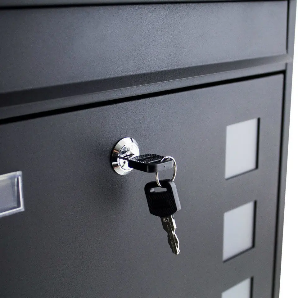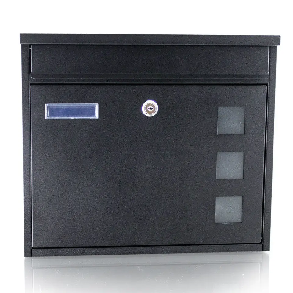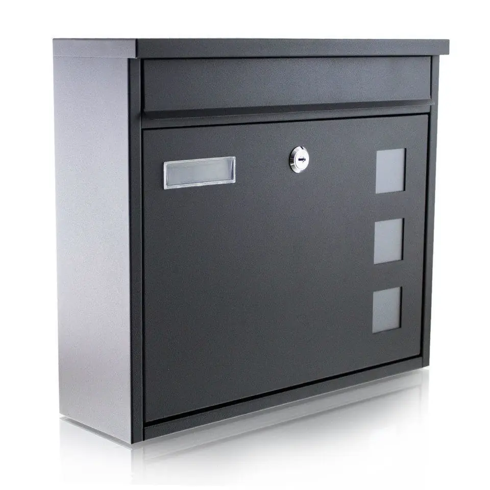 NAŚCIENNA SKRZYNKA POCZTOWA MAILBOX Skrzynka pocztowa w nowoczesnym, ponadczasowo eleganckim designie, z 3 oknami podglądu i okienkiem na nazwisko. Skrzynka pocztowa jest zamykana i nadaje się dla firm ze względu na dużą pojemność. Dostawa obejmuje elementy montażowe i dwa klucze.Cechy Produktu:- skrzynka pocztowa czarna, lakierowana proszkowo,- 3 okna podglądu,- okienko na nazwisko,- zawiera elementy montażowe