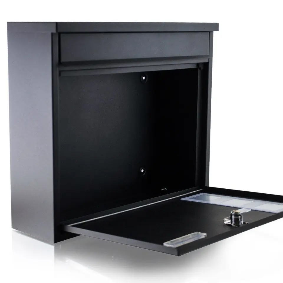 Dane Techniczne:Wymiary: 36 x 32 x 12 cm (szer / wys / gł)Wymiary wrzutu: 33 x 3 cmKolor: czarny lakierowany proszkowoMateriał: metalWaga: 1,85 kg