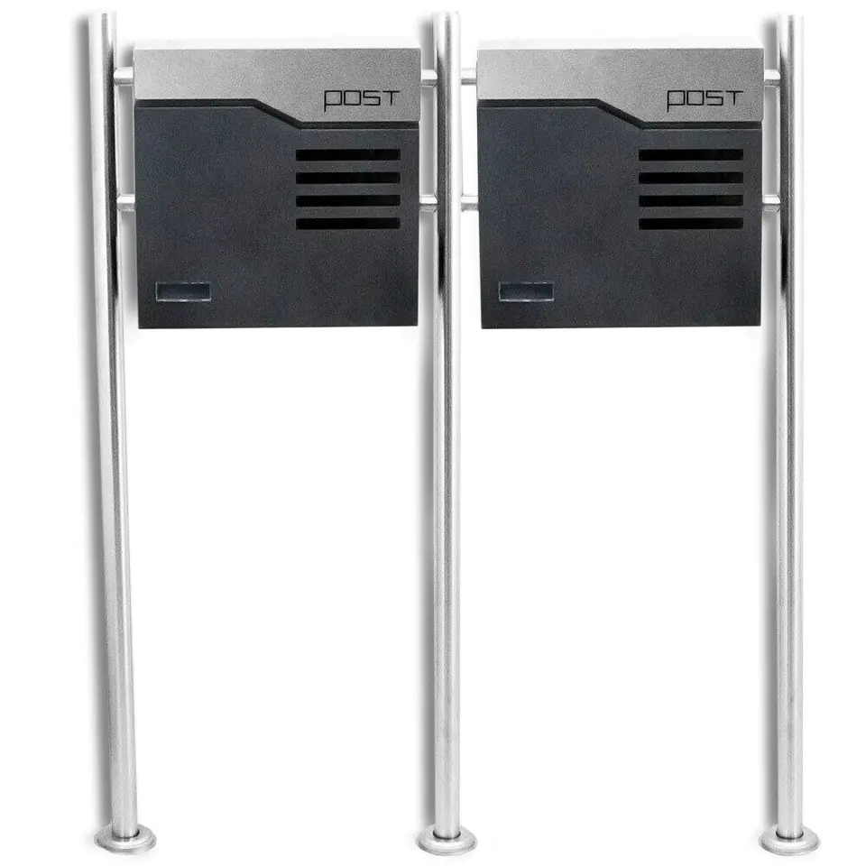 Podwójna i nowoczesna skrzynka na listy na stojaku jest odporna na opady atmosferyczne. Skrzynka pocztowa jest wykonana ze stali nierdzewnej, a grubość ścianek to około 0,8mm. Skrzynki posiadają otwory z tyłu, które pozwolą na łatwy montaż do słupków. Designerski wygląd zagwarantuje dbałość oraz styl na Twojej posesji.
