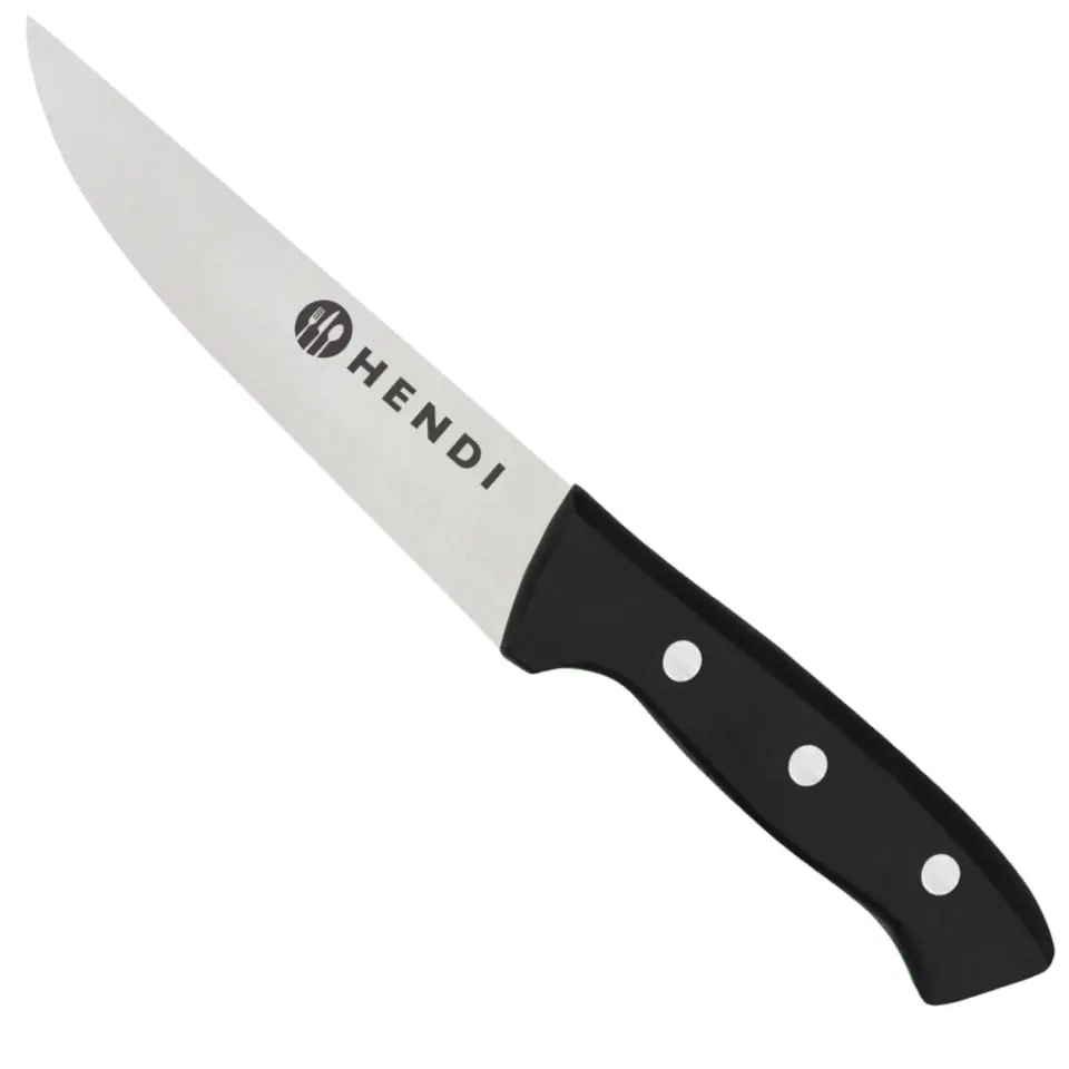 Nóż do mięsa marki Hendi charakteryzuje się wysoką jakością wykonania. Sprawdzi się zarówno w profesjonalnym użytku w restauracjach, barach jak również w domowej kuchni. Ostrze wykonane zostało ze stali chromowo-molibdenowo-wanadowej (x50CrMoV15), o twardości od 54 do 55 stopni HRC. Uchwyt wykonano z poliacetalu POM i zamocowano na 3 aluminiowe nity.