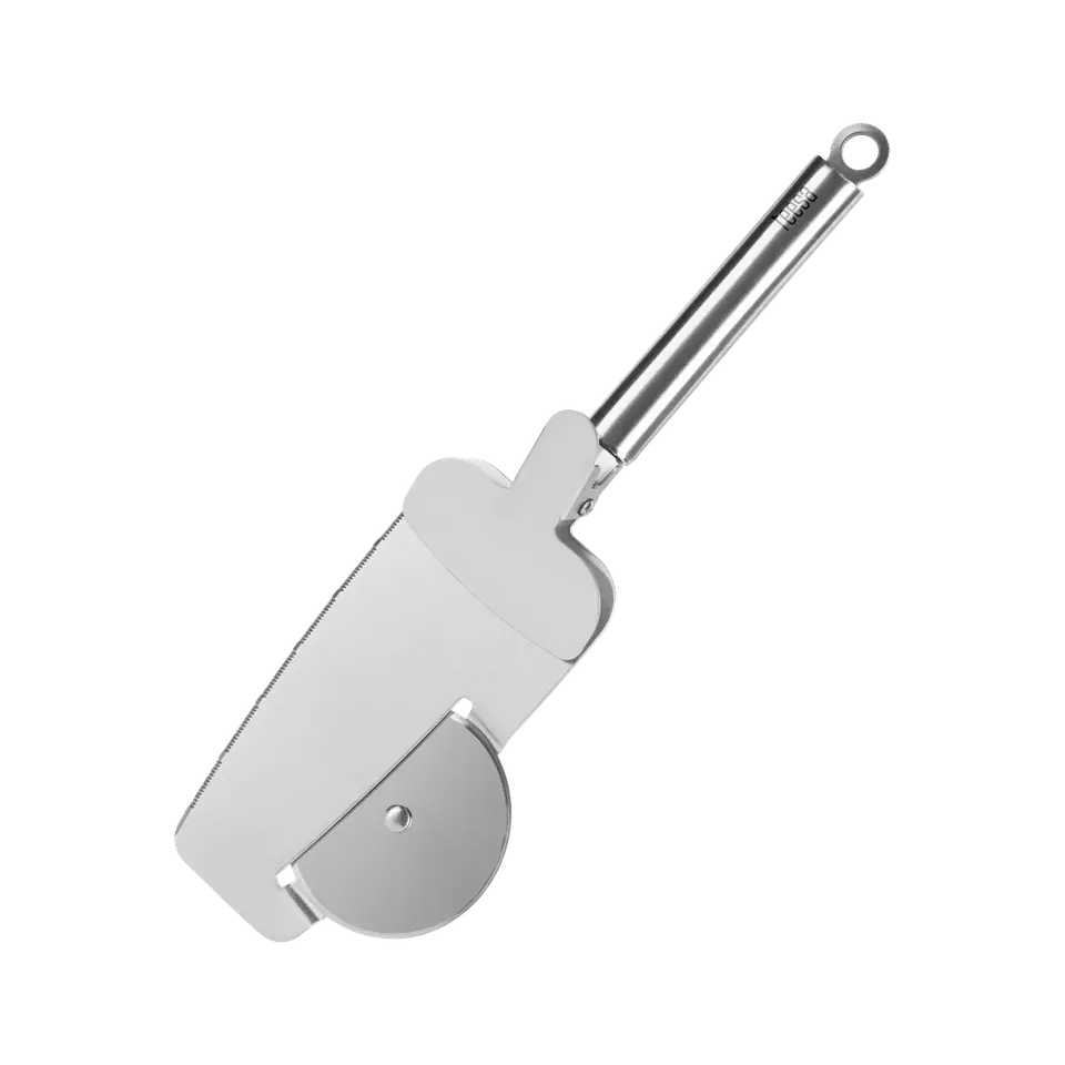 4w1: obrotowy nóż, łopatka do nabierania kawałków pizzy z ząbkowaną krawędzią, szczypce do przytrzymywaniaOtwór do zawieszaniaOdporny na wysokie temperaturyMożliwość mycia w zmywarceNietoksycznyMateriał: stal nierdzewna 430Wymiary: 28,2 x 7 x 3,5 cmWaga: 149 g