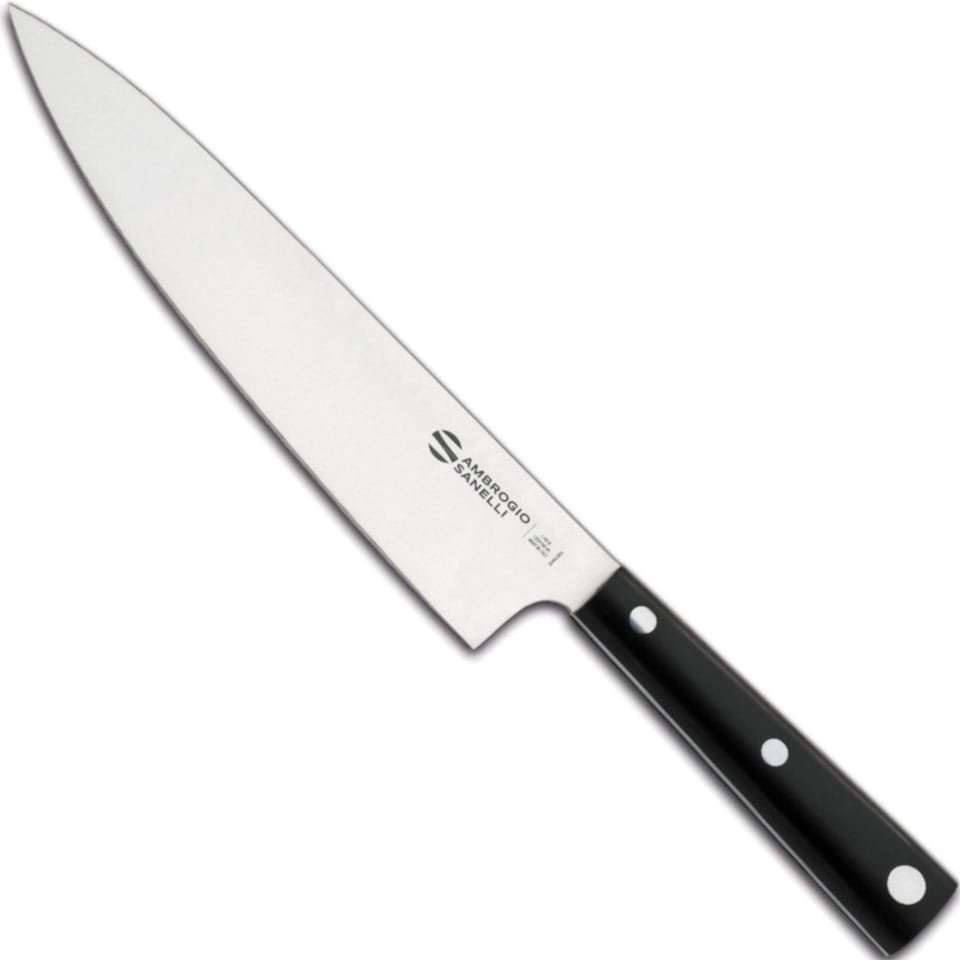 Kod producenta: H349.020Nóż Szefa kuchni marki Ambrogio Sanelli sprawdzi się do wielu różnych zadań w kuchni. Hasaki oznacza w języku japońskim "krawędź tnącą", stąd idealnie wyraża nazwę dla profesjonalnej linii noży w stylu japońskim. Ostrza noży wykonano ze specjalnie modyfikowanej stali nierdzewnej NITRO-B (X50CrMoVN15 / AISI440B), w której dodatek cząsteczek azotu znacznie polepsza właściwości antykorozyjne oraz twardość po ulepszaniu cieplnym. Twardość noża wynosi 57-58 HRC. Zgodnie z japońską techniką noże są ostrzone jednostronnie dzięki czemu żywność ma styczność z ostrzem tylko przez chwilę, co redukuje występowanie tarcia do minimum. Doskonale wyważone i wygodne nitowane uchwyty wykonano z syntetycznej żywicy POM. Nie należy myć z zmywarkach.Cechy produktu: