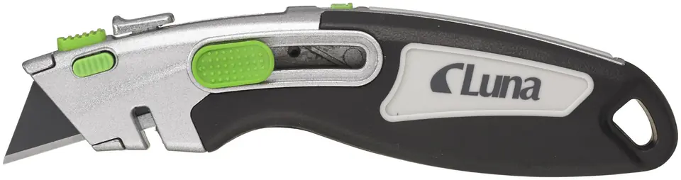 Nóż uniwersalny, model bezpieczny wzmocniony, z dwiema opcjami wysuwania ostrza: przycisk z boku do blokady stałej i przycisk od góry, zapewniający powrót sprężynowy ostrza (nóż bezpieczny). Posiada ostre wybranie do szybkiego ucinania taśmy/sznura. Obudowa ze stopu cynku z miękkimi ergonomicznymi detalami z gumy, zwiększającymi wygodę użytkowania. W rękojeści magazynek ostrzy. Dostarczany z ostrzem SK2H. Otwór do dołączenia zabezpieczenia narzędzia.
