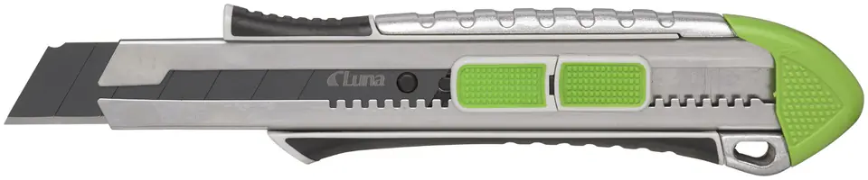 Bardzo mocny nóż z odłamywanym ostrzem, z obudową ze stopu cynku z miękkimi ergonomicznymi detalami z gumy, zwiększającymi wygodę użytkowania. Wysuwanie ostrza na dwa sposoby. Przedni przycisk wysuwa koniec ostrza na 15 mm i ma automatyczną sprężynę powrotną, doskonały do rozcinania opakowań i do innych szybkich cięć. Tylny przycisk wysuwa ostrze do żądanego występu. Tylną zatyczkę z tworzywa sztucznego można wyjąć i wykorzystać jako narzędzie do odłamywania segmentów ostrza. Dostarczany z ostrzem SK2H. Otwór do dołączenia zabezpieczenia narzędzia.
