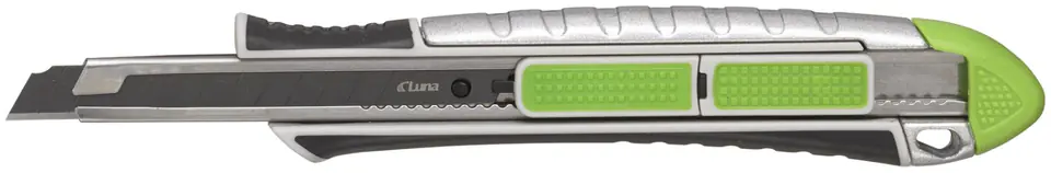 Bardzo mocny nóż z odłamywanym ostrzem, z obudową ze stopu cynku z miękkimi ergonomicznymi detalami z gumy, zwiększającymi wygodę użytkowania. Wysuwanie ostrza na dwa sposoby. Przedni przycisk wysuwa koniec ostrza na 15 mm i ma automatyczną sprężynę powrotną, doskonały do rozcinania opakowań i do innych szybkich cięć. Tylny przycisk wysuwa ostrze do żądanego występu. Tylną zatyczkę z tworzywa sztucznego można wyjąć i wykorzystać jako narzędzie do odłamywania segmentów ostrza. Dostarczany z ostrzem SK2H. Otwór do dołączenia zabezpieczenia narzędzia.