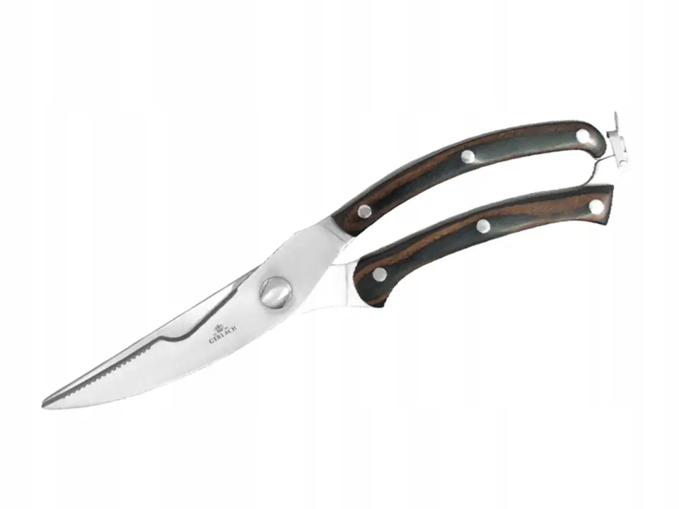 Nożyce do drobiu firmy GERLACH doskonale nadają się do cięcia ugotowanego lub surowego mięsa drobiowego na kawałki, jak i do porcjowania całego kurczaka. Produkt poradzi sobie doskonale również z przecinaniem kości, chrząstek i skóry.Nożyce zostały wykonane z najwyższej jakości stali nierdzewnej, która zapewnia ostrość, trwałość oraz odporność na korozję.Specjalnie wyprofilowane rękojeści zagwarantują wysoki komfort użytkowania.Produkt jest wyposażony w system bezpiecznej blokady, zapobiegający przypadkowemu otwarciu.Dostępne modele nożyc do drobiu: z drewnianą rękojeścią