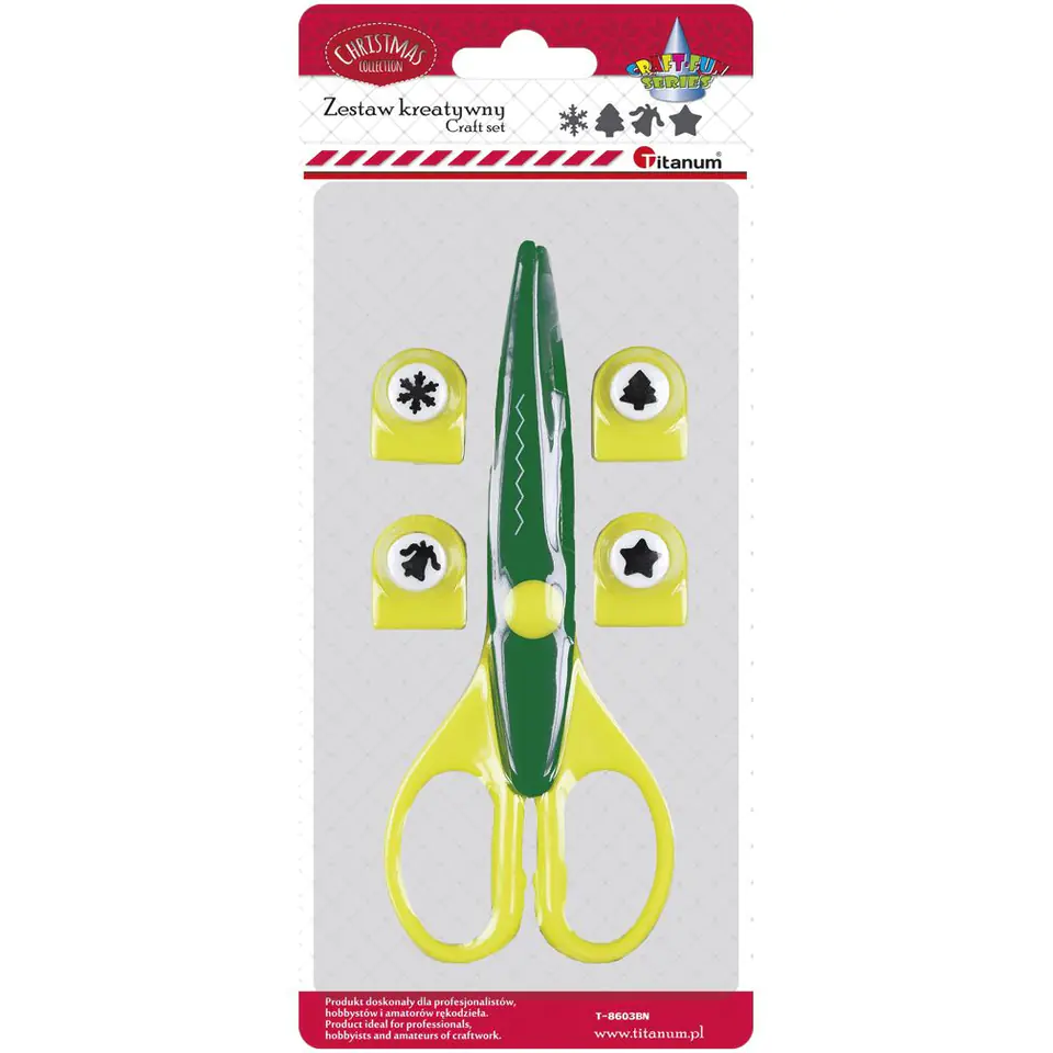 Zestaw kreatywny składający się z nożyczek oraz dziurkaczy z ozdobnymi bożonarodzeniowymi motywami. Idealny do wszelkiego rodzaju prac artystycznych. Doskonały do dekorowania m.in.: zaproszeń, kartek okolicznościowych, kopert, zakładek do książek. Niezastąpiony w technice scrapbookingu. Zestaw zawiera: 1 nożyczki dekoracyjne (długość całkowita: 15,5 cm), 4 dziurkacze kreatywne (wzór o rozmiarze: 1 cm).