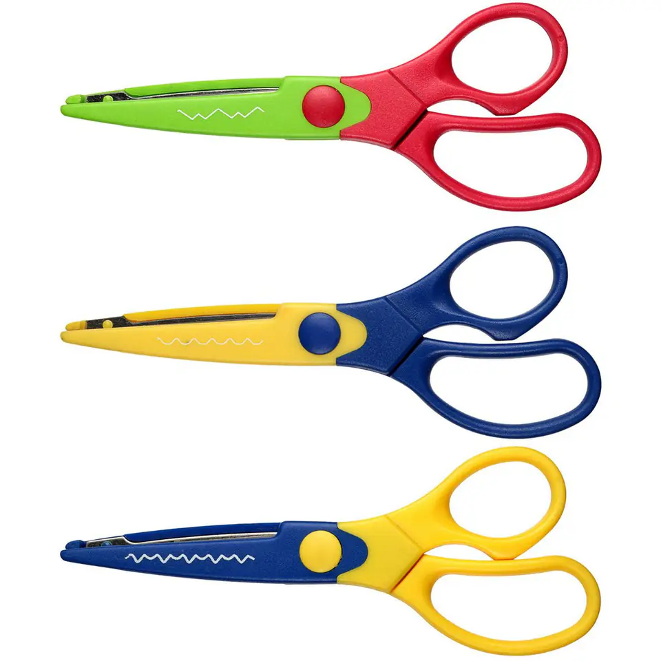 Nożyczki dekoracyjne do wycinania fantazyjnych wzorów. Ostrza wykonane ze stali nierdzewnej a uchwyt nożyczek z mocnego, trwałego plastiku w różnych kolorach, charakterystycznych dla danego wzoru cięcia. Długość nożyczek: 16,5 cm.