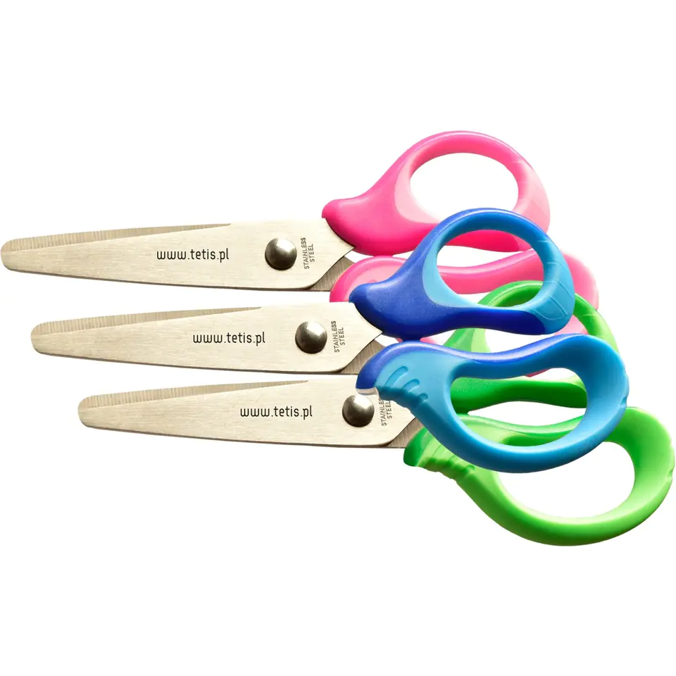 Nozyczki dla dzieci marki TETIS wykonane ze stali nierdzewnej z zaokrąglonymi koncówkami.