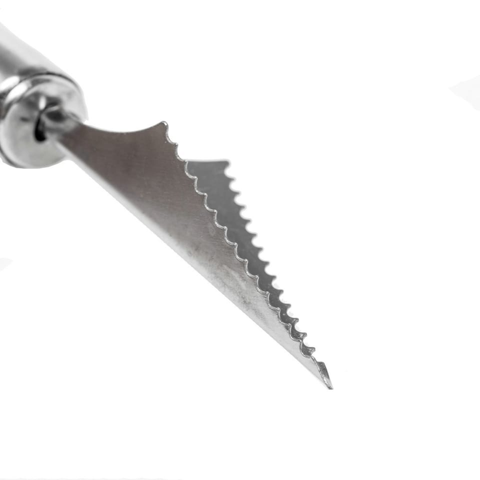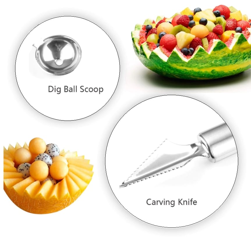 Świetny zestaw do krojenie i atrakcyjnego podawania owoców. Nożyk oraz specjalna wykrywaczka dekoracyjna w jednym zestawie. Nie od dziś wiadomo, że "je się oczami", dlatego pięknie podane owocowe przekąski będą cieszyć nie tylko nasz wzrok, ale również będą o wiele lepiej smakować. Nożyk świetnie sprawdzi się przy sprawnym i efektownym krojeniu i serwowaniu arbuza, melona czy bardziej egzotycznych owoców jak np. pitaja, ale również można nim kroić i podawać niektóre ciasta. Dzięki dwustronnej dekoracyjnej wykrawaczce będziecie mogli robić owocowe lub warzywne kule, ząbkowany szpikulec pozwala wycinać w owocach lub warzywach efektowne wzory