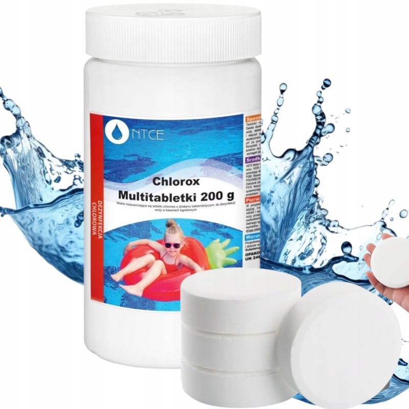 Produktów biobójczych należy używać z zachowaniem środków ostrożności.Przed każdym użyciem należy przeczytać etykietę i informacje dotyczące produktu.PROFESJONALNA CHEMIA BASENOWA NTCENTCE TABLETKI MULTIFUNKCYJNE 12w1CHLOR DO BASENU, JACUZZI, SPA200g - opakowanie 1 kg - otrzymujesz 5 szt tabletek 200g PRODUKT POLSKI Tabletki multifunkcyjne do basenu to niezastąpiony produkt, który pozwala utrzymać wodę w Twoim basenie czystą i świeżą przez długi czas.Dzięki wielofunkcyjnej formule, te tabletki nie tylko oczyszczają wodę z zanieczyszczeń, ale także dbają o odpowiedni poziom chloru, zapobiegają rozwojowi glonów, a także poprawiają jakość wody, sprawiając, że kąpiel staje się przyjemnością.TABLETKI WOLNO ROZPUSZCZAJĄCE SIĘ O DZIAŁANIU BAKTERIOBÓJCZYMDO DEZYNFEKCJI WODY TABLETKI 12w1 - JEDYNE TAKIE NA ALLEGRO 12 FUNKCJI CHLORU DO BASENU:Dezynfekcja wody – zabija bakterie, wirusy, grzyby i inne drobnoustroje.Szokowe chlorowanie – szybkie podniesienie poziomu chloru w nagłych przypadkach.Usuwanie glonów – skuteczne niszczenie zielonej, śliskiej warstwy w wodzie i na ścianach basenu.Zapobieganie rozwojowi mikroorganizmów – regularne stosowanie chroni wodę.Utlenianie zanieczyszczeń organicznych – rozkład potu, śliny, kosmetyków, mocznika itp.Przywracanie klarowności wody – usuwa przyczyny mętności.Neutralizacja chloramin – usuwa związki powodujące „zapach chloru” i podrażnienia.Przygotowanie wody na sezon – idealny do pierwszego chlorowania wiosną.Zabezpieczenie basenu po intensywnym użytkowaniu – np. po imprezie, dużej liczbie kąpiących się.Stabilizacja poziomu chloru – zwłaszcza w produktach zawierających stabilizator (np. dichlor).Zapobieganie namnażaniu się owadów – woda z odpowiednim poziomem chloru nie przyciąga komarów.Przedłużenie żywotności filtracji i systemów basenowych – czysta woda to mniejsze ryzyko osadów i biofilmu. Nasz produkt posiada stwierdzone działanie bakteriobójcze.Niszczy patogeny takie jak Escherichia coliPseudomonas aeruginosaStaphylococcus aureusEnterococcus hiraeLegionella pneumophilaCandida albicansAspergillus NigerDokładne dawki i czasy potrzebne do uzyskania efektu biobójczego dla powyższych szczepów podane są na etykiecie produktu.Dozowanie: Jeżeli zawartość aktywnego chloru przekracza wartość 0,5 mg/ dm3 nie należy wtedy korzystać z basenu. Obniżyć dawkę chloru i poczekać, aż ta wartość spadnie do wyznaczonego zakresu. Można również obniżyć zawartość aktywnego chloru przy pomocy dezaktywatora chloru. Zawartość aktywnego chloru w wodzie basenowej oraz odczyn pH należy sprawdzać regularnie przy pomocy odpowiednich testów do pomiaru tych parametrów. Całkowita dawka aktywnego chloru nie powinna przekraczać 0,5mg/dm3 wody basenowej w chwili użytkowania jej przez ludzi Dawka skuteczna produktu: tabletka 200g – na 40m3 wody Niebieski kolorant - pogłębia błękitny odcień wody. Nadaje wodzie niebieski odcień! BEZPIECZEŃSTWO Produktów biobójczych należy używać z zachowaniem środków ostrożności. Przed każdym użyciem należy przeczytać etykietę i informacje dotyczące produktu.Należy unikać: wdychania, kontaktu ze skórą, oczami oraz spożywania. W wypadku narażenia postępować zgodnie z instrukcją na etykiecie produktu.Niebezpieczny dla środowiska w szczególności organizmów wodnych.Produkt należy przechowywać w oryginalnym opakowaniu, w chłodnych i przewiewnych pomieszczeniach z dala od substancji utleniających, kwasów i substancji łatwopalnych. Opakowanie powinno być wyraźnie oznakowane. Chronić przed wilgocią i kontaktem z innymi substancjami.Temperatura składowania 5 - 25°C.