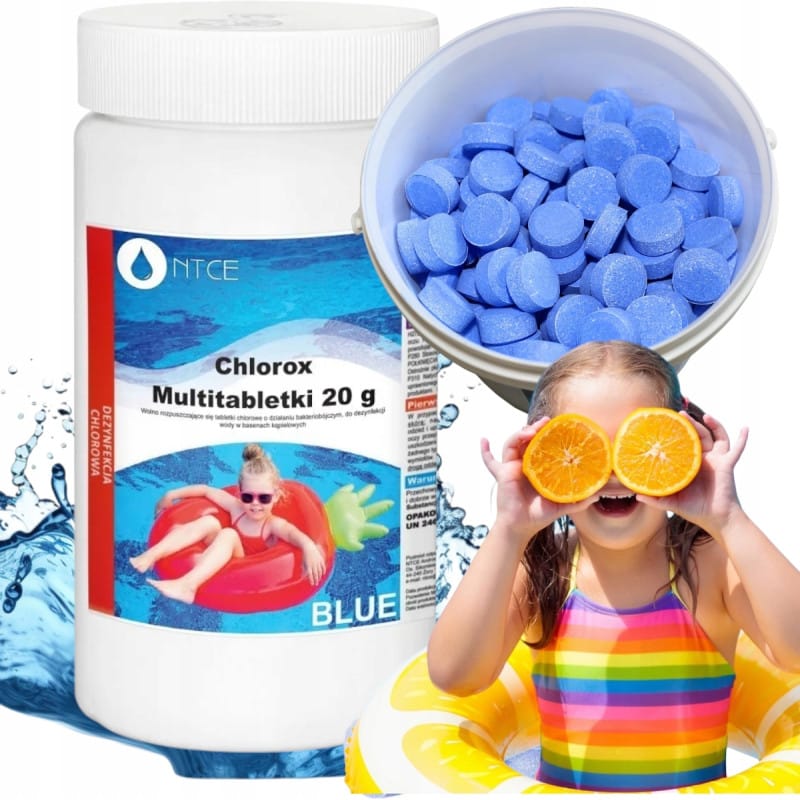 Produktów biobójczych należy używać z zachowaniem środków ostrożności.Przed każdym użyciem należy przeczytać etykietę i informacje dotyczące produktu.PROFESJONALNA CHEMIA BASENOWA NTCENAJLEPSZY TOWAR NA RYNKUCHLOR - TABLETKI MULTI MULTIFUNKCYJNE 20 gBLUE - NIEBIESKIEok. 50 szt tabletek 20 g - opakowanie 1 kg NAJWYŻSZA JAKOŚĆ PRODUKT POLSKI Tabletki multifunkcyjne do basenu to niezastąpiony produkt, który pozwala utrzymać wodę w Twoim basenie czystą i świeżą przez długi czas.Dzięki wielofunkcyjnej formule, te tabletki nie tylko oczyszczają wodę z zanieczyszczeń, ale także dbają o odpowiedni poziom chloru, zapobiegają rozwojowi glonów, a także poprawiają jakość wody, sprawiając, że kąpiel staje się przyjemnością.Jeśli chcesz cieszyć się czystą, krystalicznie przejrzystą wodą w swoim basenie, nasze tabletki multifunkcyjne to doskonały wybór.Dają pewność, że basen jest odpowiednio zabezpieczony przed mikroorganizmami i glonami, a Ty możesz skupić się na relaksie i zabawie. Nasz produkt posiada stwierdzone działanie bakteriobójcze.Niszczy patogeny takie jak:Escherichia coliPseudomonas aeruginosaStaphylococcus aureusEnterococcus hiraeLegionella pneumophila JEDEN PREPARAT WIELE KORZYŚCI !Zapewniają natychmiastową dezynfekcjęTabletki bardzo wolno/długo rozpuszczalneDziałanie bakteriostatyczneDziałanie bakteriobójczeNadają wodzie niebieski odcieńStabilizowane przeciw zbyt szybkiemu ubytkowi chloru pod wpływem ciepła i słońca TABLETKI 11w1 1. NIEBIESKI KOLORANT - BŁĘKITNY ODCIEŃ WODY2. GLONASTYTYCZNE DZIAŁANIE3. DEZYNFEKCJA4. DZIAŁANIE BAKTERIOSTATYCZNE5. KLAROWANIE WODY6. FLOKULACJA7. STABILIZACJA WOLNEGO CHLORU8. NABŁYSZCZANIE9. DZIAŁANIE BAKTERIOBÓJCZE10. STABILIZACJA pH11. ODKAMIENIANIEDLACZEGO WARTO KUPIĆ TABLETKI NTCETabletki multifunkcyjne wolno rozpuszczające, o działaniu bakteriobójczym, o długotrwałej dezynfekcji i klarowania wody basenowej.Zawartość aktywnego chloru ok. 90 %Znakomity środek do pielęgnacji wody basenowej o działaniu wielofunkcyjnym:dezynfekują wodę w basenie,zapobiegają powstawaniu glonów,wspomagają flokulacje zawiesin (łączenie się cząstek brudu w celu łatwiejszego wychwycenia przez pompę),stabilizują wartość pH,rozpuszczają się bardzo powoli, przez co są bardzo wygodne do stosowania.TABLETKI możesz używać w przypadku:basenów przydomowych bez automatycznej stacji dozującej,basenów z automatyczną stacją dozującą. STOSOWANIE TABLETEK 1 tabletka wystarcza na 4 m3 wody basenowej, średnio na okres ok 6-7 dni. Tabletki najlepiej dawkować poprzez włożenie ich do pływaka dozującego. Po pełnym rozpuszczeniu tabletki/tabletek dozujemy kolejną porcję.Wpływ słońca, liczba osób kąpiących się i wysokie temperatury podwyższają zużycie chloru.Raz na 3 tygodnie zaleca się przeprowadzenie dodatkowego chlorowania granulatem Chlorox T56 granulat.Wskazówki:Nigdy nie wrzucać tabletek bezpośrednio do basenu. Grozi wybieleniem folii!!!Proszę przestrzegać wskazówek i informacji zawartych na etykiecie w karcie charakterystyki !Sposób użycia tabletek chlorowych 6w1 Chlorox BLUE:Sprawdzić odczyn pH wody (prawidłowa wartość: 6,8 – 7,4).W przypadku innej wartości zastosować korektor Balancer pH minus lub Balancer pH plus .Dozowanie należy przeprowadzić w okresie gdy w basenie nie ma kąpiących się osób. Zalecana aplikacja za pomocą boi dozującej lub skimera – umieszczając w nich odpowiednią ilość tabletek i włączając pompę cyrkulacyjną.Zalecane jest Jednoczesne chlorowanie wody przy pomocy preparatu do szybkiej chlorowej dezynfekcji, tak aby poziom aktywnego chloru w wodzie wynosił 0,3 – 0,5 mg/dm3 - NTCE Chlorox T56.Jeżeli zawartość aktywnego chloru spadnie poniżej poziomu 0,3 mg/ dm3 należy zwiększyć ilość tabletek Chlorox.Jeżeli zawartość aktywnego chloru przekracza wartość 0,5 mg/ dm3 nie należy wtedy korzystać z basenu. Obniżyć dawkę chloru i poczekać, aż ta wartość spadnie do wyznaczonego zakresu.Całkowita dawka aktywnego chloru nie powinna przekraczać 0,5mg/dm3 wody basenowej w chwili użytkowania jej przez ludzi.UWAGAProduktów biobójczych należy używać z zachowaniem środków ostrożności.Przed każdym użyciem należy przeczytać etykietę i informacje dotyczące produktu.NIEBIESKA WODABASENCHEMIA DO BASENUKOD PRODUKTU : 70322