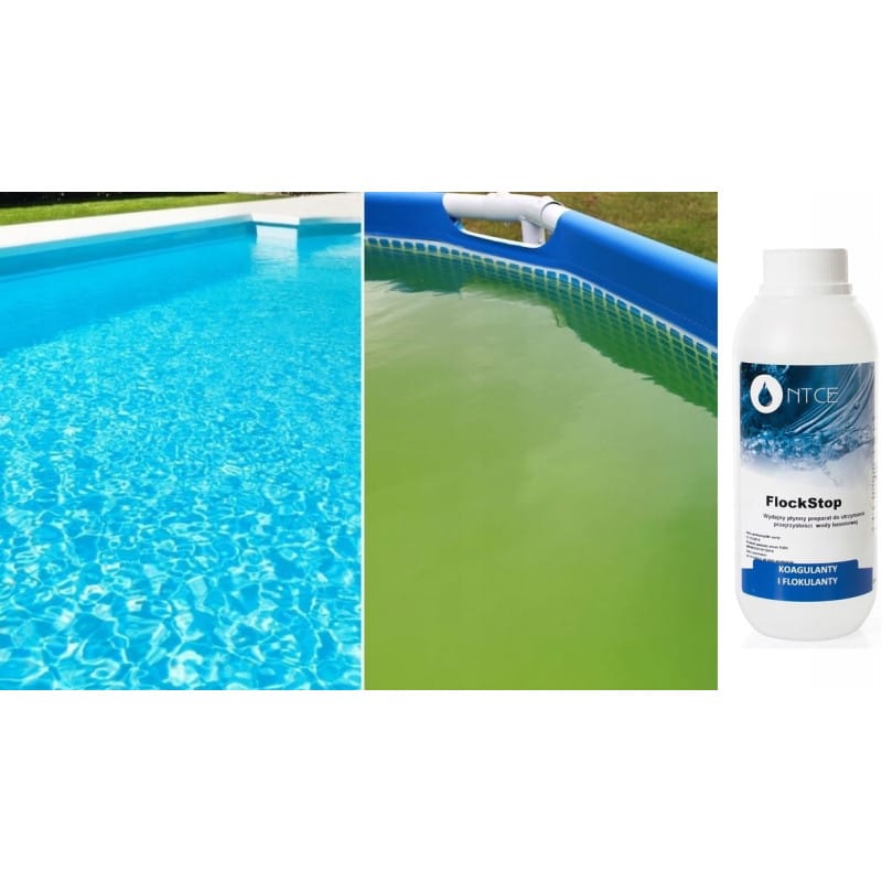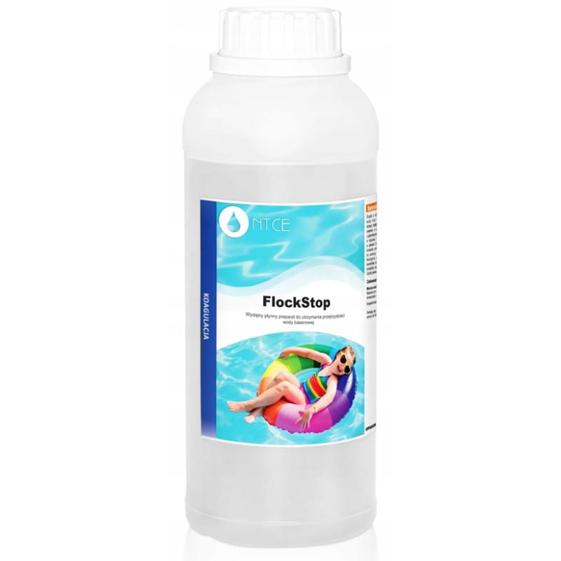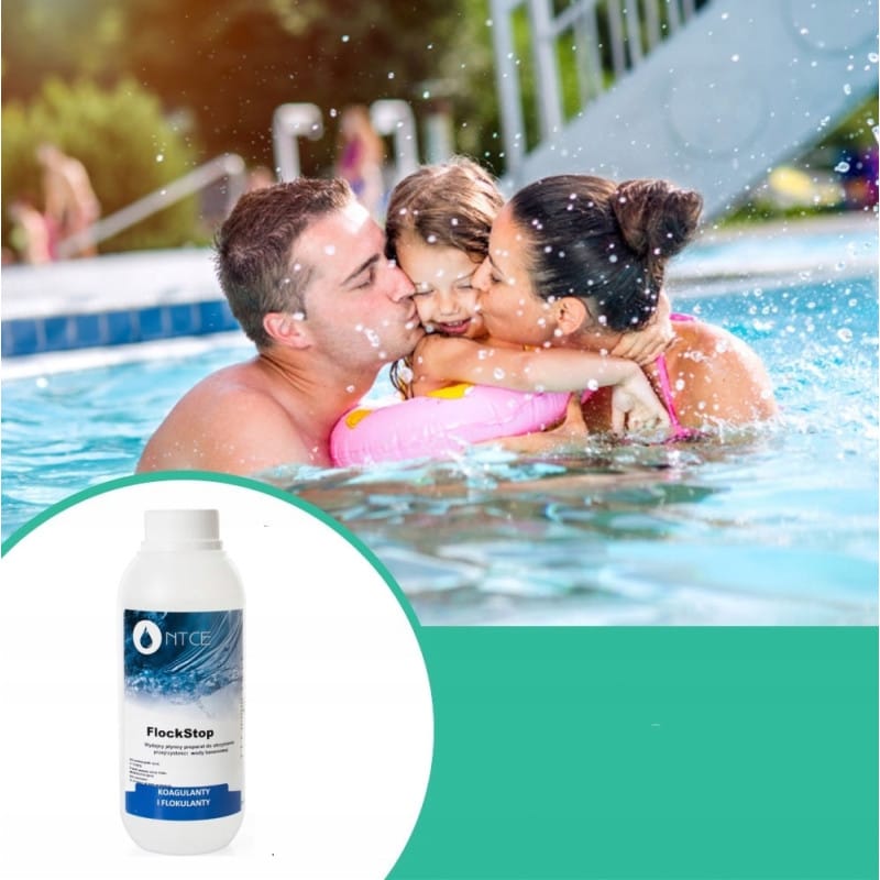 Produktów biobójczych należy używać z zachowaniem środków ostrożności.Przed każdym użyciem należy przeczytać etykietę i informacje dotyczące produktu. CHEMIA BASENOWANTCEFLOCKSTOPKOAGULANT DO BASENUCHLOR DO BASENUPOJEMNOŚĆ: 1 LPreparat do usuwania mętności wody basenowej i uzyskiwania efektu krystalicznej przeźroczystości. Nadaje się zarówno do ręcznego, jak i automatycznego dozowania.Flockfix to płynny środek koagulacyjny z szerokim spektrum wartości pH. Jego działanie polega na minimalizowaniu zmętnień w wodzie.Flockfix ułatwia łączenie się zanieczyszczeń w duże płatki, które można łatwo usunąć z basenu.FLOCKFIX PŁYNNY - to środek koagulacyjny. Dzięki swojemu dopracowanemu składowi bardzo szybko łączą drobne zanieczyszczenia w większe płatki brudu, dzięki czemu pozostają one w naszym filtrze, a nie w basenie. JAK PRZEBIEGA PROCES KOAGULACJI Pewne związki chemiczne, a zwłaszcza sole glinu i żelaza, charakteryzują się tym, że po rozpuszczeniu w wodzie przekształcają się w wodorotlenki nierozpuszczalne w wodzie, które tworzą puszyste i kłaczkowate osady. Już w czasie tworzenia się kłaczków pobierają one z wody drobiny rozproszonych substancji. Powstały w ten sposób kłaczek jest w stanie wchłonąć na swojej powierzchni kolejne zanieczyszczenia.Istotną rolę w tym procesie odgrywa przyciąganie elektrostatyczne. Związki organiczne koloidalnie rozproszone, np. substancje białkowe, są ujemnie naładowane, natomiast kłaczki powstałe w wyniku koagulacji są naładowane dodatnio i są tak duże, że zatrzymuje je filtr piaskowy. KRYSTALICZNIE PRZEJRZYSTA WODA Zadaniem koagulantów jest połączenie się z drobnymi zanieczyszczeniami i wytrącenie ich z wody, zatrzymując je w filtrze, wspomagając przy tym pracę filtra piaskowego. Użycie koagulantu sprawi, że woda w naszym basenie będzie krystalicznie czysta, a jej prezencja na pewno cieszyć będzie nasze oko.Zastosowanie środka powoduje powstawanie z maleńkich zanieczyszczeń (pyłków) większych cząstek, które zatrzymywane są przez filtr lub opadają na dno i można je zebrać odkurzaczem podwodnym. Po dodaniu preparatu należy sprawdzać ciśnienie na manometrze i w razie potrzeby wykonać płukanie filtra. Działa najlepiej przy pH w przedziale 7,0-7,6. Szybko tworzy na lustrze wody płatki zanieczyszczeń, które łatwo odfiltrować. WŁAŚCIWOŚCI:Służy do krystalizacji wody w baseniePostać płynuPoprawia wydajność złoża filtracyjnegoZapobiega i usuwa zmętnienie wodyNaturalny odczyn pHBardzo wydajnyBezwonnyBardzo ważną częścią utrzymywania wysokiej jakości wody w basenie jest koagulacja.Koagulacja jest procesem usprawniającym działanie filtrów. Za pomocą specjalnych preparatów możliwe jest skupienie drobnych cząstek zanieczyszczeń, dzięki czemu stają się one możliwe do usunięcia za pomocą filtra.W wodzie o temperaturze powyżej 20 st.C dochodzi do wzmożonego rozwoju bakterii i zarazków. Im temperatura wyższa, tym rozwój ten jest szybszy. Do zahamowania tego procesu stosuje się środki utleniające w postaci organicznych i nieorganicznych związków chloru (w postaci granulatu lub tabletek) lub preparatów na bazie aktywnego tlenu. Substancje te „spalają” drobnoustroje i dezynfekują w ten sposób wodę w niecce. Idealne stężenie wolnego chloru to 0,6 – 1,0 mg/l (Zawartość tlenu aktywnego powinna być większa od 5 mg/l). DOZOWANIE:Produkt można aplikować bezpośrednio z pojemnika dostawczego za pomocą pompy dozującej, bądź ręcznie. Produkt można rozcieńczyć w stosunku 1:10 (dla pomp o dużej wydajności). Przy ciągłym stosowaniu FlockStop należy ustawić dozowanie w zakresie 0,5 – 1,5 g na każdy m3 .W celu wzmocnienia działania preparatu FlockStop należy na wstępie uregulować wartość pH wody basenowej pomiędzy 7.0-7.4 za pomocą korektorów pH Balancer pH minus lub Balancer pH plus w postaci płynu lub granulatu. Następnie preparat FlockStop dodać bezpośrednio do wody basenowej w ilości od 20 do 100 ml koncentratu na 10 m3 wody, w zależności od stopnia jej zmętnienia przy sprawnym układzie filtracyjnym. W przypadku dużego obciążenia basenu dawkę można podwoić.SPOSÓB UŻYCIA:Działa optymalnie przy pH 4,5-9. Temperatura wody oraz aktualne stosowane metody uzdatniania nie mają wpływu na skuteczność preparatu, którego najlepsze działanie osiąga się przy ciągłym dozowaniu. FlockStop wspomaga zlepianie małych cząsteczek zmętnień w większe, które następnie zatrzymywane są na złożu filtracyjnym.KOAGULACJANiektóre cząsteczki zanieczyszczeń są tak małe, że filtr nie jest w stanie ich wyłapać. W celu ich usunięcia należy stosować środki powodujące skupianie się małych cząstek w większe. W wyniku takiego zabiegu zanieczyszczenia te pozostają na filtrze, a woda jest klarowna i czysta. ZALETY STOSOWANIA FLOCKFIX PŁYNNYBrak drobnych zanieczyszczeń , które wcześniej nie były filtrowane przez nasz filtr.Długa data ważności - bez problemu można ją przechowywać przez 3 lata (wg. producenta) z doświadczenia nawet do 10lat !!!Środek koagulacyjny FLOCKFIX PŁYNNY rozpuszcza się się bardzo szybko !Służy do stosowania we wszystkich basenach z filtrem piaskowym!Optymalne działanie przy pH 4,5 do 9, idealne 7,0-7,4Używa się bez rozcieńczenia lub w rozcieńczeniu 1:10Do basenów kąpielowych oraz basenów whirlpoolPOSIADA ATEST PZH NR HK/W/0099/08/2006Pozwala na uzyskanie krystalicznie czystej wody!!!! STOSOWANIE PREPARATU Produkt w płynie podaje się za pomocą pompy dozującej z opakowania dostawczego bezpośrednio do wody surowej, przy czym dysza dozująca musi być tak zabudowana, aby miejsce wtrysku znajdowało się w środku instalacji rurowej, aby osiągnąć gwarantowane wymieszanie. Miejsce wtrysku powinno znajdować się możliwie tuż przed pompą obiegową lub tuż za nią, aby wykorzystać drogę i czas reakcji. Ilość do
