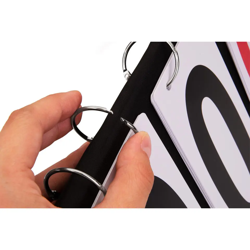 - Materiał: Stal - kółko, PVC - karty, podstawa - karton pokryty materiałem PP
