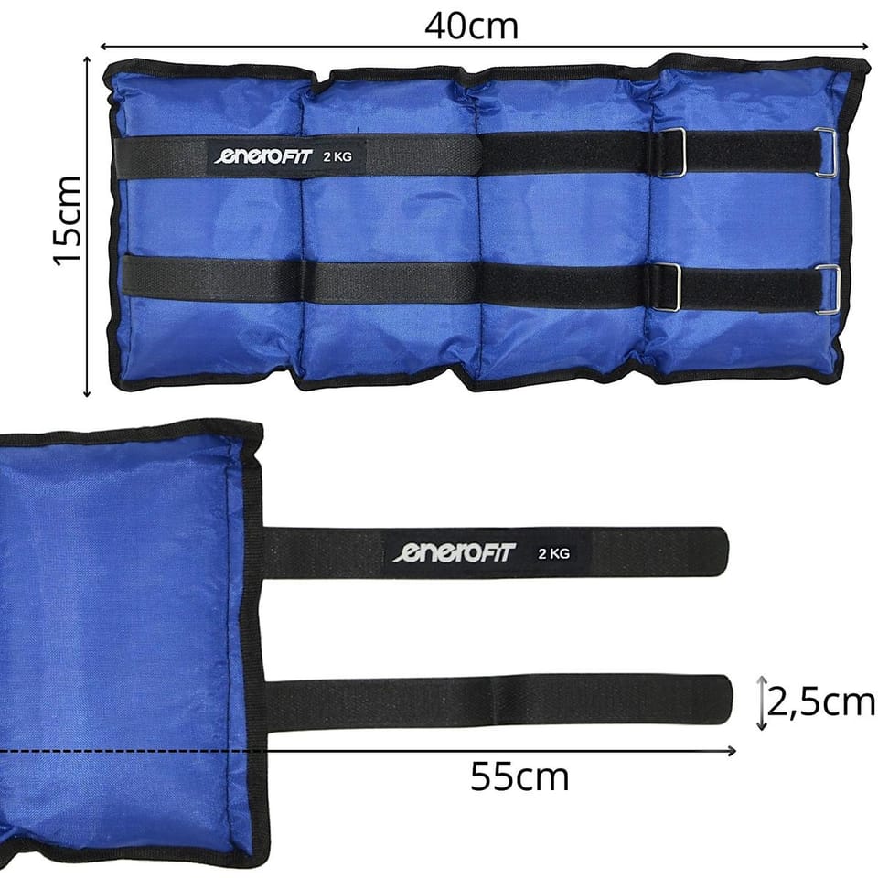Parametry:- Wymiary ok: 40 x 15 x 3,5 cm (dł. x szer. x gr.)Wymiar całkowity rzepa ok.: 55 x 2,5 cm (dł. x szer.)Długość rzepa do regulacji szerokości: 21 cmMateriał: terylen, opiłki metalu, rzep, stalowa klamraIlość klamer do regulacji na jednym obciążeniu: 2 szt.Waga netto ok.: 4,071 kg Waga brutto ok.: 4,078 kgWymiary opakowania (folia): 40 x 16 x 6 cm (wys. x szer. x gr.)Kolor: niebieskiZestaw zawiera 2 obciążenia po ok. 2 kgMarka: ENERO FIT