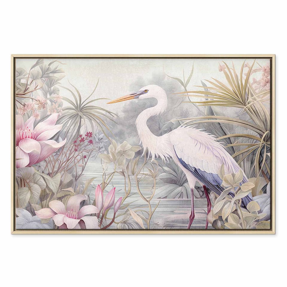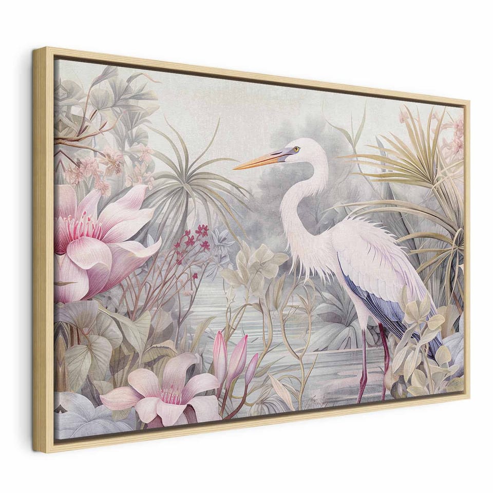 Obraz - Czapla brodząca w stawie - ilustracja w jasnej kolorystyce rozmiar 120x80, wykończenie W ramie drewnianej naturalnej