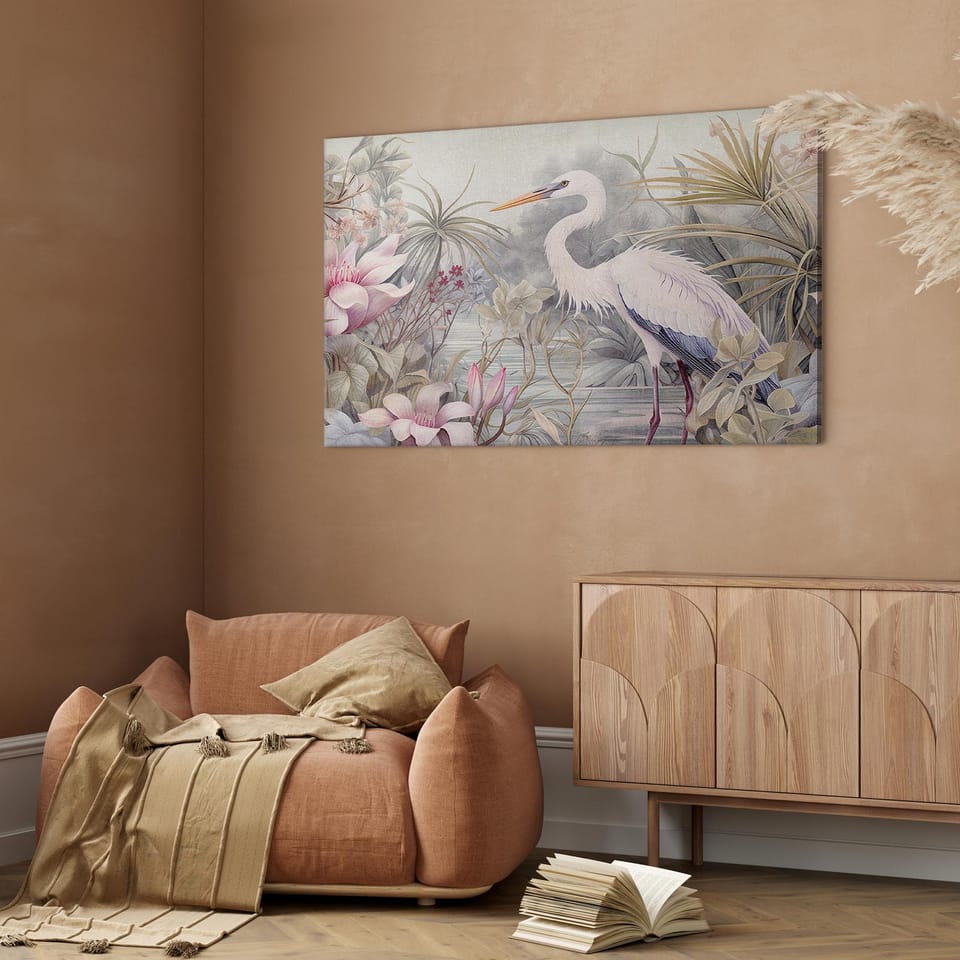 Obraz - Czapla brodząca w stawie - ilustracja w jasnej kolorystyce rozmiar 60x40, wykończenie Akustyczny