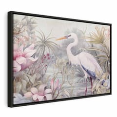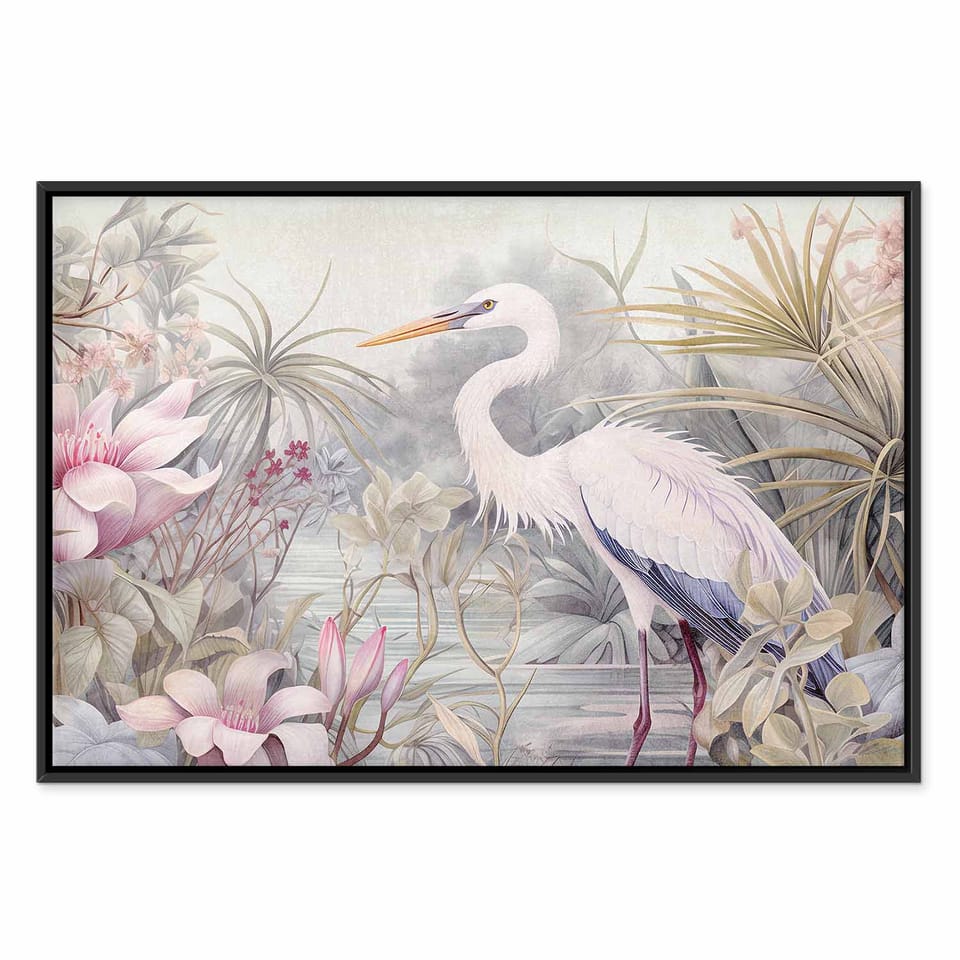 Obraz - Czapla brodząca w stawie - ilustracja w jasnej kolorystyce rozmiar 90x60, wykończenie W ramie drewnianej czarnej