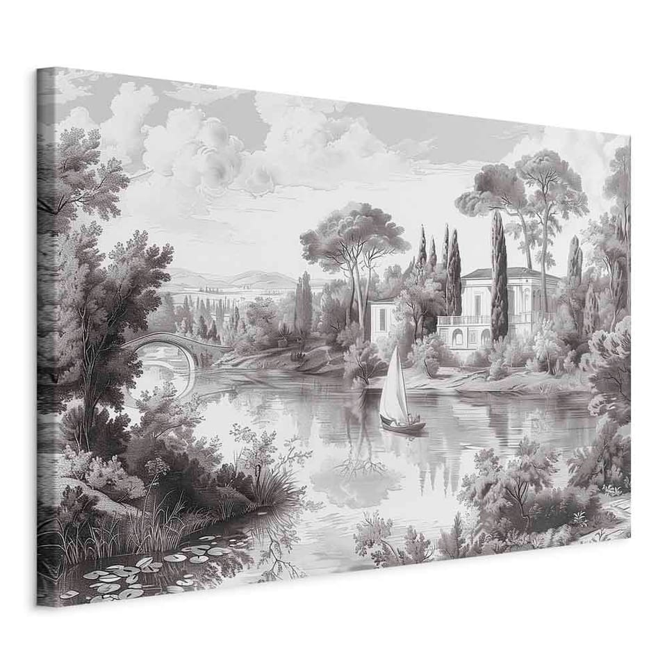 Obraz - Czarno-biały pejzaż vintage retro widok na staw z łódką rozmiar 60x40, wykończenie Standard