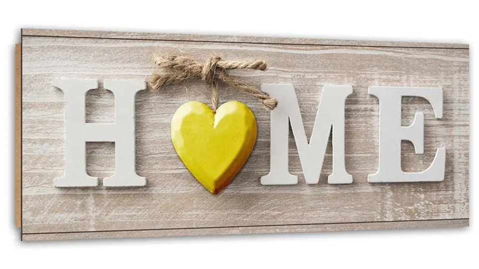 Obraz Deco Panel, Napis Home z zółtym sercem na jasnym drewnie (Rozmiar 150x50)