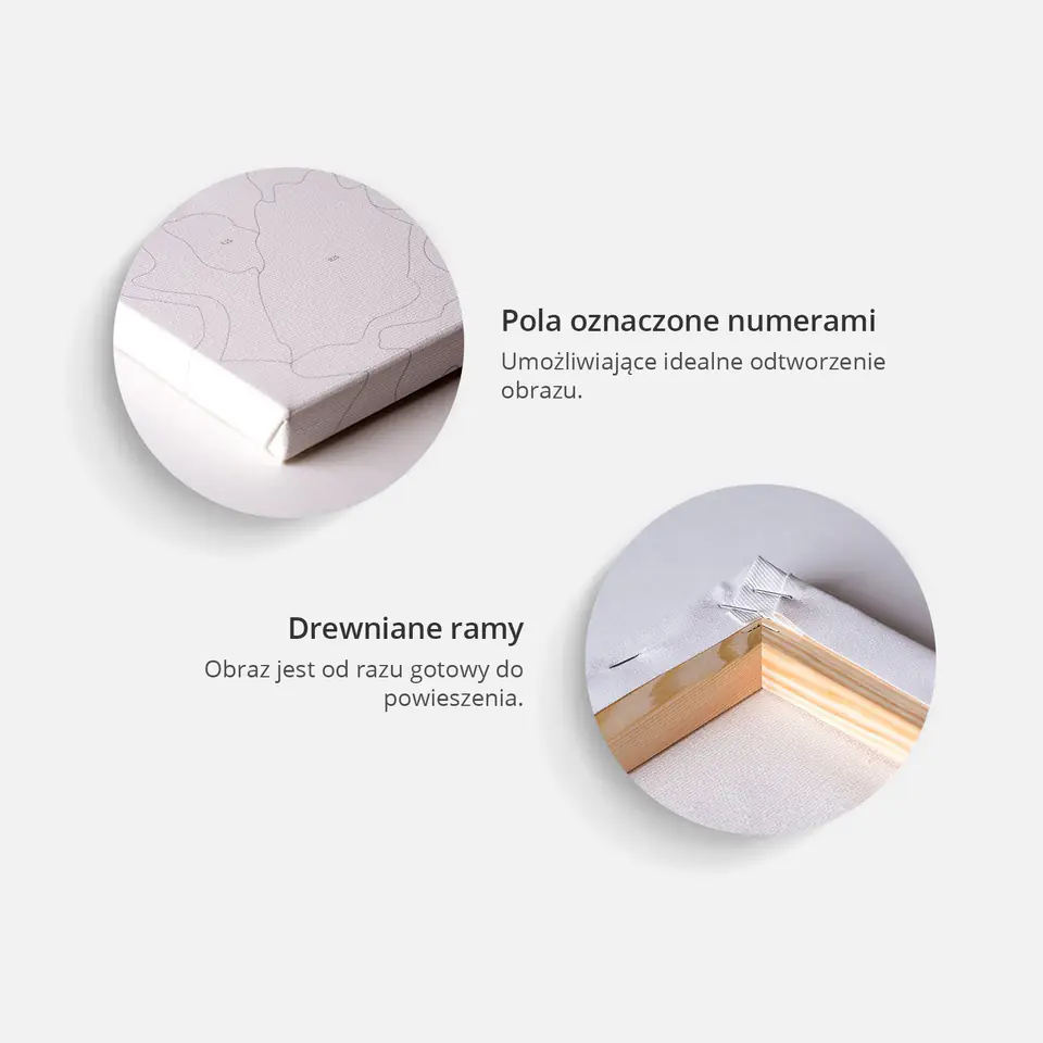 Wysokiej jakości płótno naciągnięte na drewniane krosno (100% drewno świerkowe), profesjonalne pędzle malarskie i wysokiej klasy farby akrylowe w pojedynczych pojemniczkach sprawią, że Twój obraz stanie się prawdziwym dziełem sztuki.