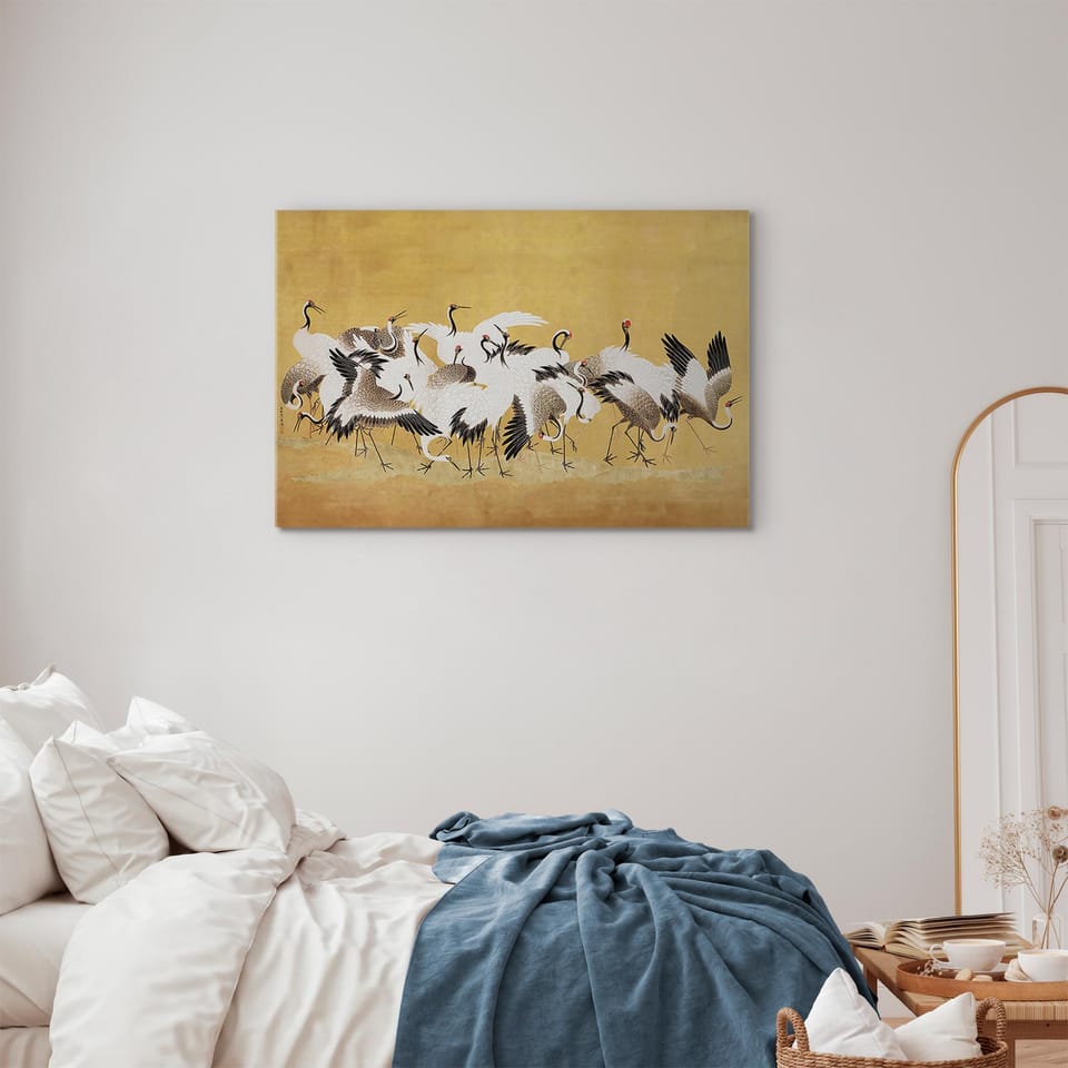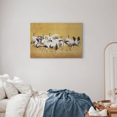 Obraz - Japońskie żurawie - stado ptaków na tle w odcieniu złota na podstawie obrazu Ishida Yūtei rozmiar 60x40, wykończenie Akustyczny