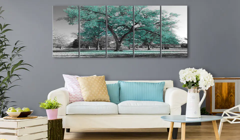 Obraz - Jesień w parku (5-częściowy) wąski turkusowy rozmiar 200x80, wykończenie Premium Print