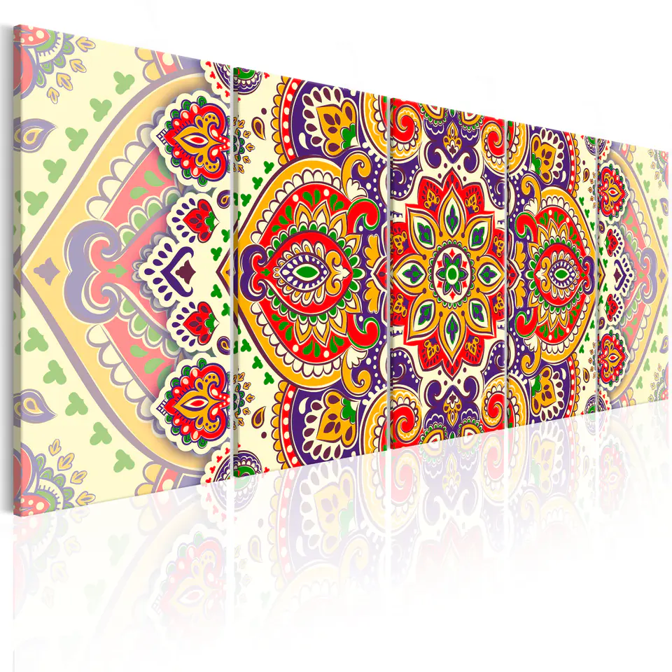 Obraz "Obraz - Kolorowy ornament" jest drukowany na specjalnym płótnie flizelinowym idealnie odwzorowującym kolory. Płótno jest naciągnięte na lekką, ale stabilną ramę wykonaną z materiałów przyjaznych dla środowiska. Dekorację z najwyższej półki zapewnia druk wysokiej jakości, dzięki któremu kolory są wyraziste, a detale znakomicie odtworzone, niezależnie od formatu obrazu.