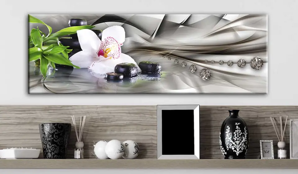 Obraz - Kompozycja Zen: bambus, orchidea i kamienie rozmiar 150x50, wykończenie Standard