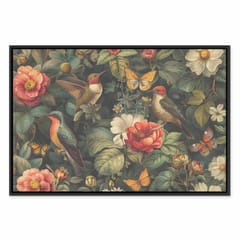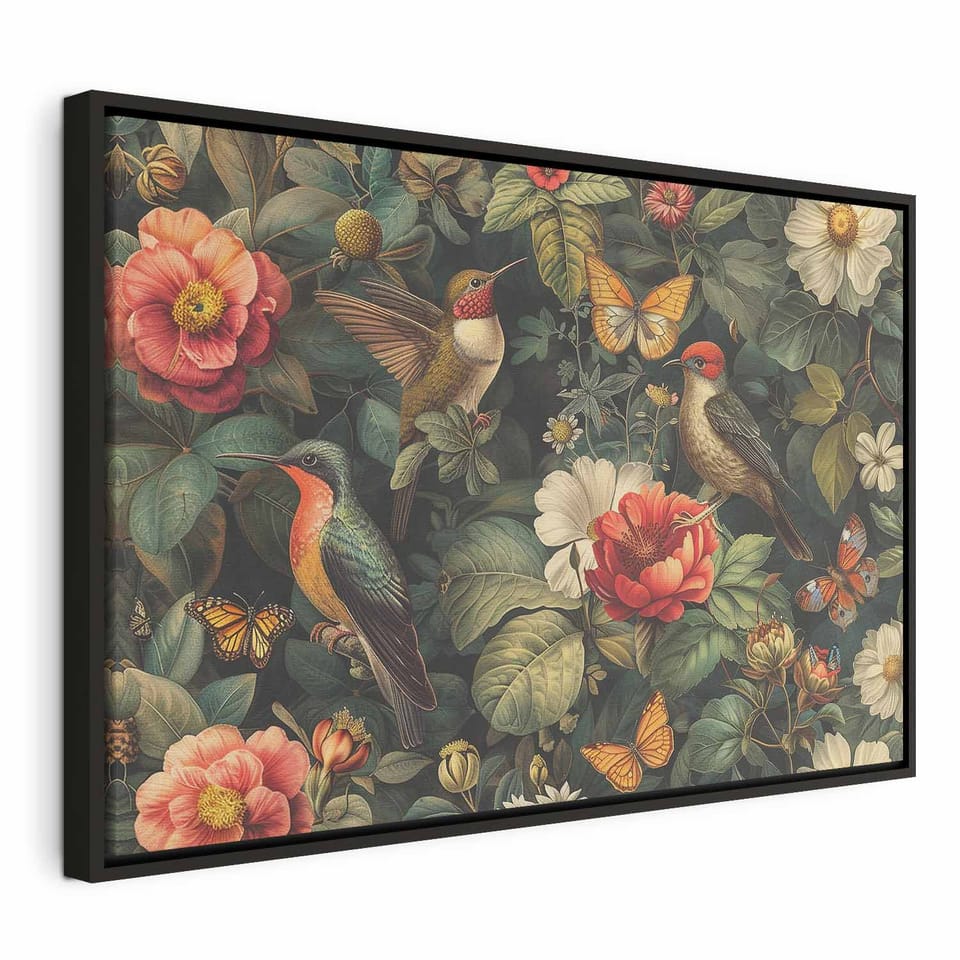 Obraz - Kwiaty, ptaki i motyle - ilustracja w stylu vintage rozmiar 120x80, wykończenie W ramie drewnianej czarnej