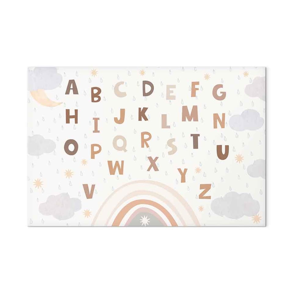 Obraz - Literki ponad tęczą - Literki pośród strug deszczu i chmur z tęczą księżycem i gwiazdkami na jasnym tle rozmiar 30x20, wykończenie Na płótnie włoskim