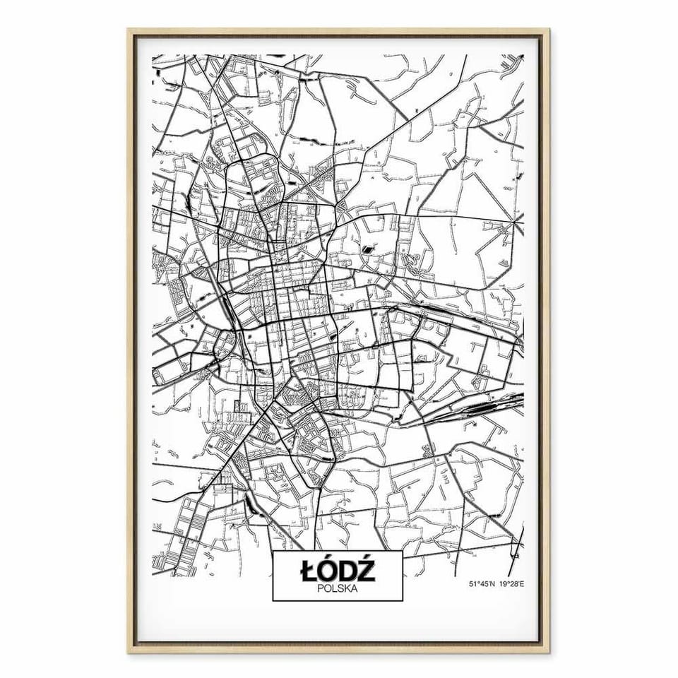 Obraz - Mapa miasta: Łódź (1-częściowy) pionowy rozmiar 80x120, wykończenie W ramie drewnianej naturalnej