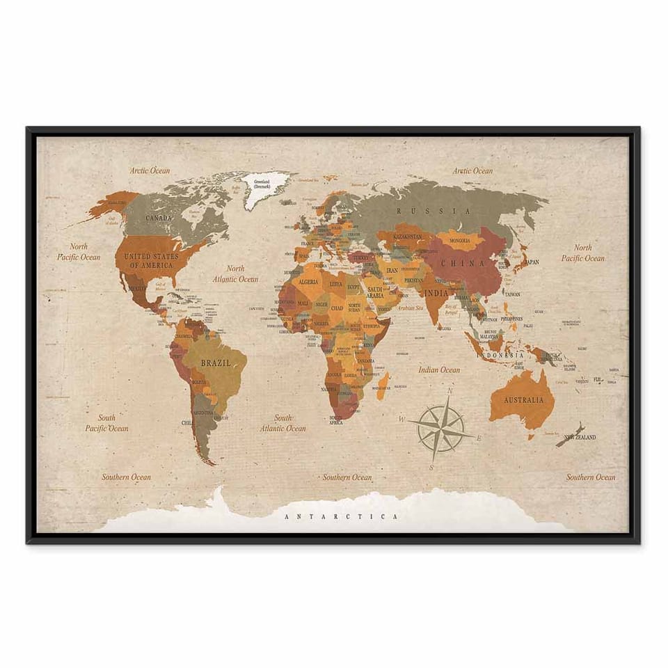 Obraz - Mapa świata: Beżowy szyk rozmiar 90x60, wykończenie W ramie drewnianej czarnej
