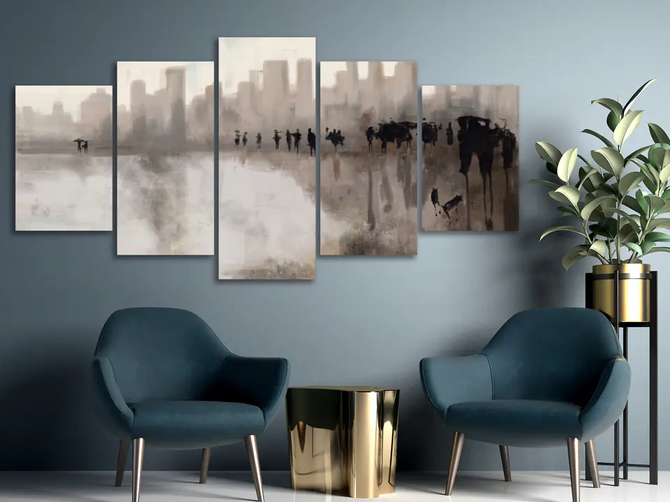 Obraz - Miasto w deszczu (5-częściowy) szeroki rozmiar 225x112.5, wykończenie Na płótnie włoskim