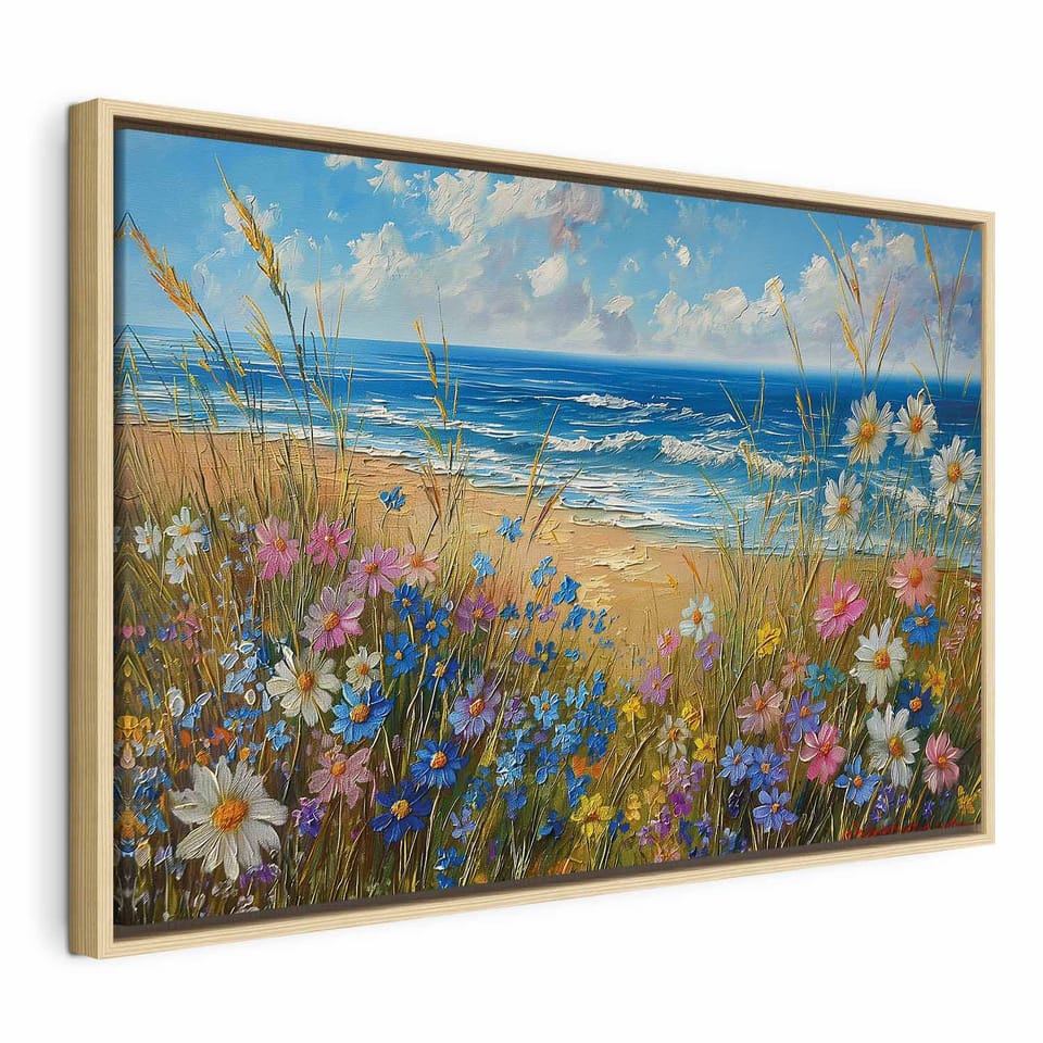 Obraz - Morski krajobraz - polne kwiaty i widok na wzburzone morze rozmiar 120x80, wykończenie W ramie drewnianej naturalnej