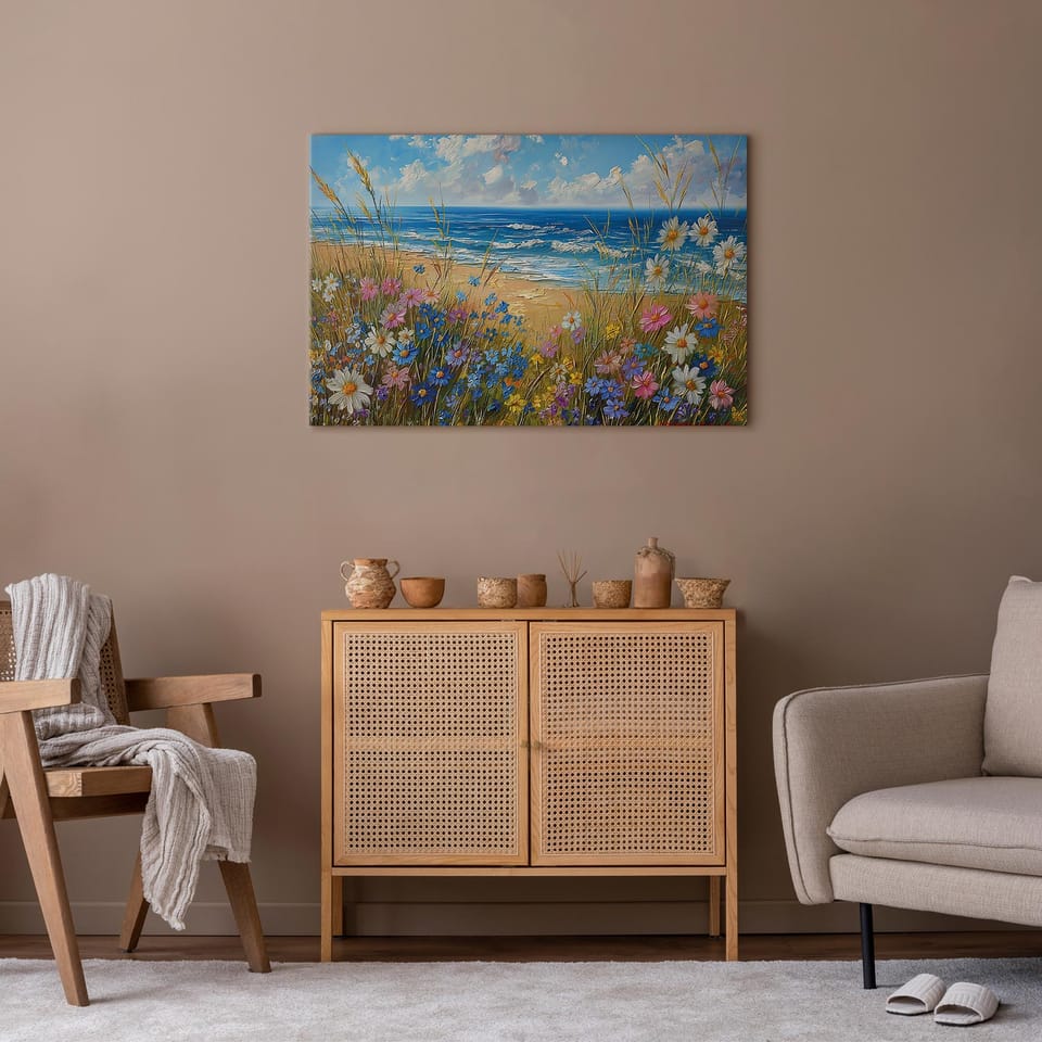 Obraz - Morski krajobraz - polne kwiaty i widok na wzburzone morze rozmiar 30x20, wykończenie Akustyczny
