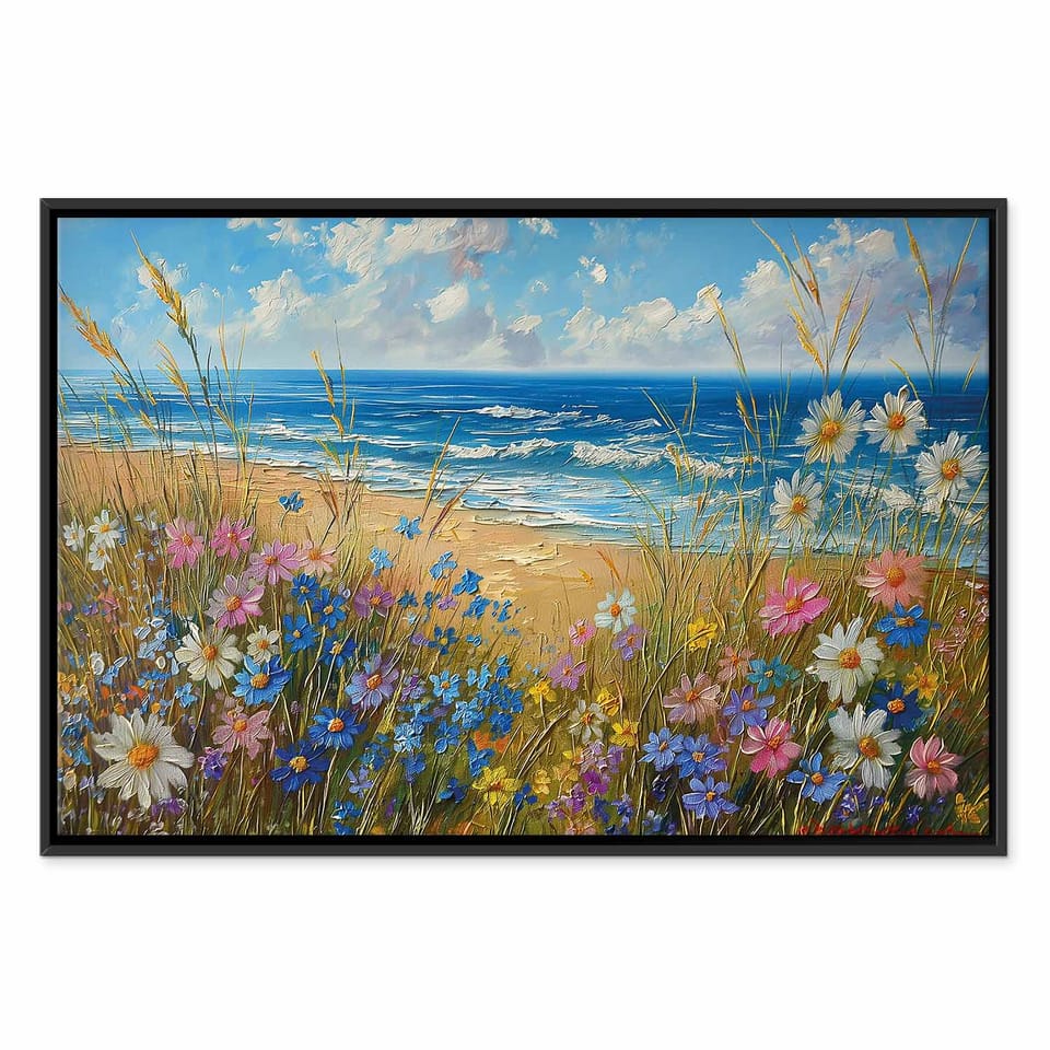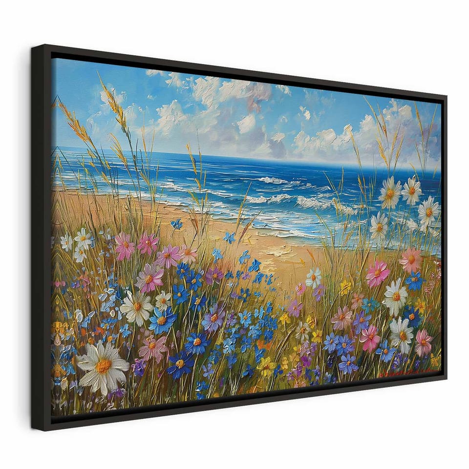Obraz - Morski krajobraz - polne kwiaty i widok na wzburzone morze rozmiar 90x60, wykończenie W ramie drewnianej czarnej