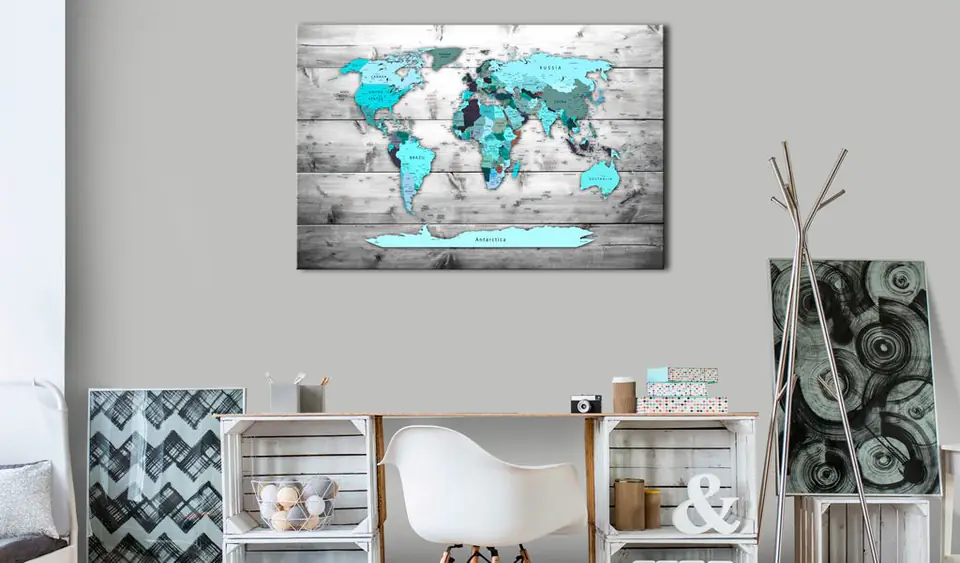 Obraz na korku "Obraz na korku - Błękitne kontynenty [Mapa korkowa]" to produkt dla osób poszukujących oryginalnych ozdób na ścianę. Ekologiczny materiał i ciekawy wzór sprawiają, że zwykła tablica korkowa zmienia się w stylowy dodatek, który możesz wykorzystać w rozmaity sposób. Do obrazów na korku można przypinać pinezki, zaznaczać odwiedzone miejsca na mapie lub doczepiać notatki. Obraz na korku "Obraz na korku - Błękitne kontynenty [Mapa korkowa]" jest o wiele lżejszy od tradycyjnych dekoracji ściennych. Dzięki temu ozdobne tablice korkowe mogą zawisnąć w dowolnym miejscu w Twoim mieszkaniu bądź biurze. Płótno z wydrukiem nakładane jest na płytę korkową. Dzięki temu nadruk cechuje się wyrazistymi kolorami i oddaje najdrobniejsze detale. Przypnij do niego pinezki lub notatki i stwórz swój indywidualny wzór na swojej ścianie!