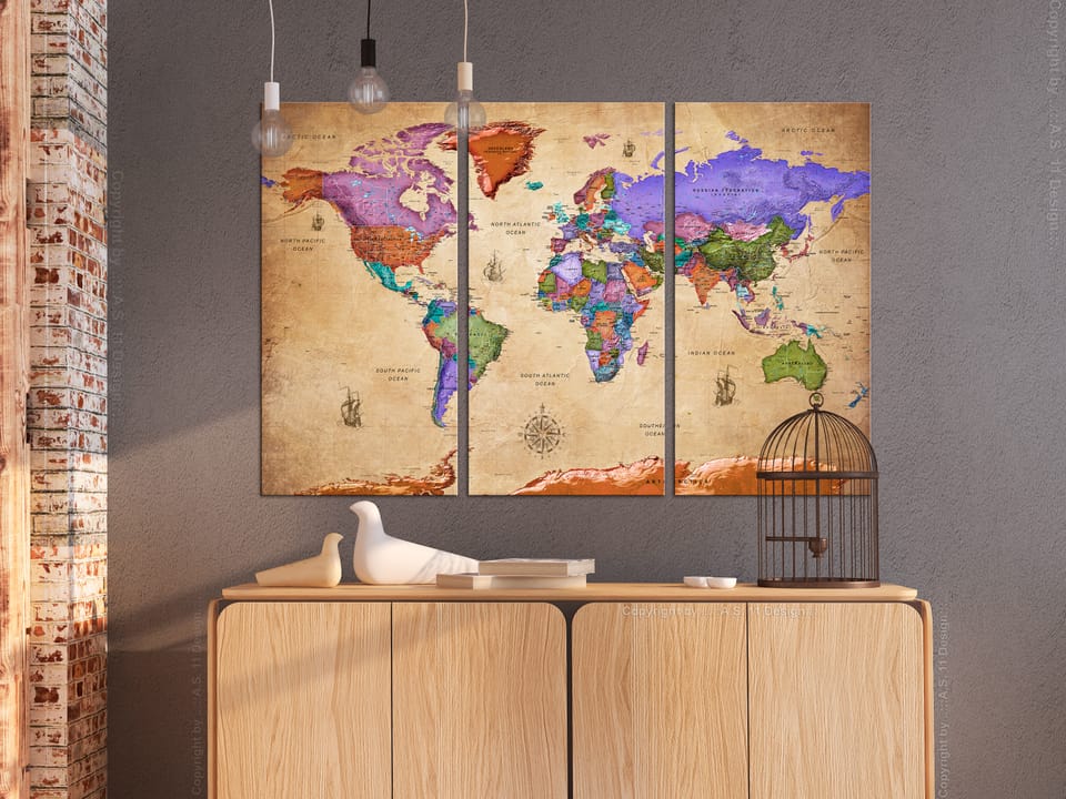 Obraz na korku "Obraz na korku - Kolorowe podróże (3-częściowy) [Mapa korkowa]" to produkt dla osób poszukujących oryginalnych ozdób na ścianę. Ekologiczny materiał i ciekawy wzór sprawiają, że zwykła tablica korkowa zmienia się w stylowy dodatek, który możesz wykorzystać w rozmaity sposób. Do obrazów na korku można przypinać pinezki, zaznaczać odwiedzone miejsca na mapie lub doczepiać notatki. Obraz na korku "Obraz na korku - Kolorowe podróże (3-częściowy) [Mapa korkowa]" jest o wiele lżejszy od tradycyjnych dekoracji ściennych. Dzięki temu ozdobne tablice korkowe mogą zawisnąć w dowolnym miejscu w Twoim mieszkaniu bądź biurze. Płótno z wydrukiem nakładane jest na płytę korkową. Dzięki temu nadruk cechuje się wyrazistymi kolorami i oddaje najdrobniejsze detale. Przypnij do niego pinezki lub notatki i stwórz swój indywidualny wzór na swojej ścianie!