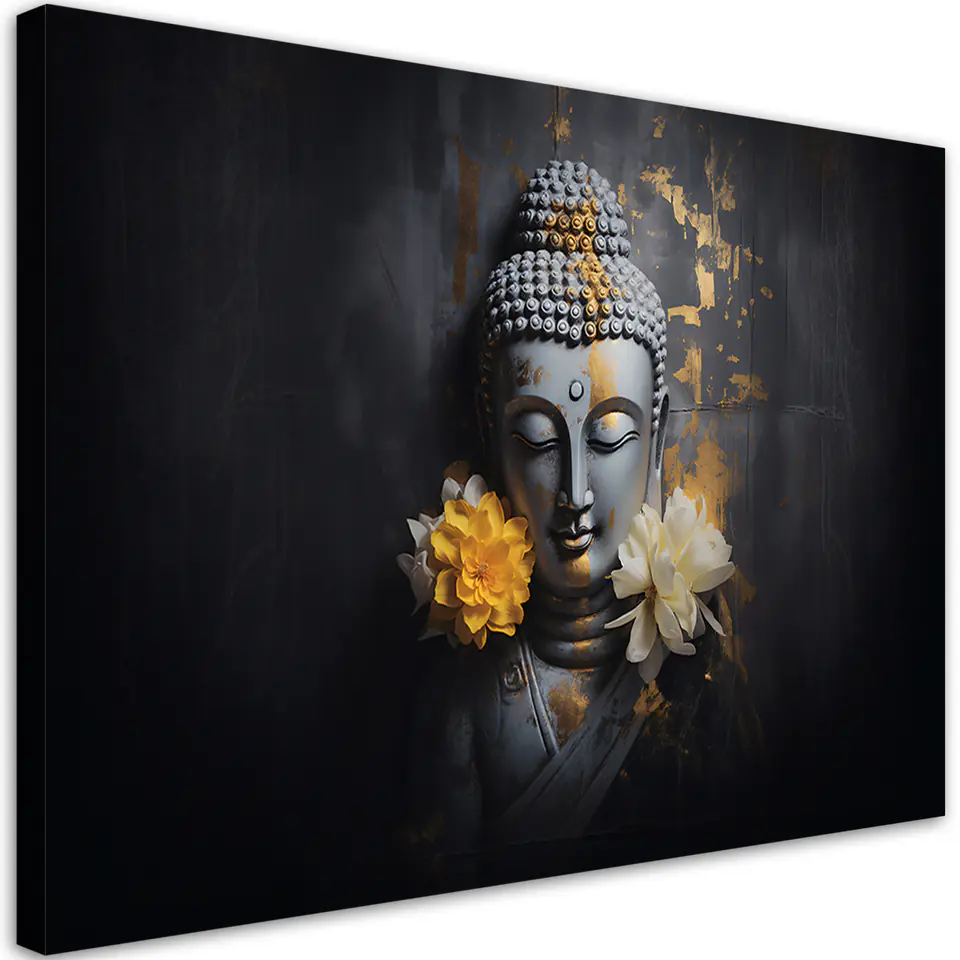 Obraz na płótnie, Szary budda i kwiaty (Rozmiar 90x60)