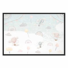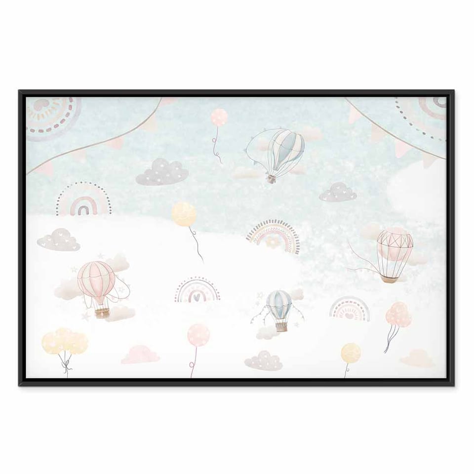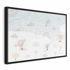 Obraz - Niebo z balonami - Balony w stonowanej kolorystyce latające po niebie wśród chmur tęczy i gwiazd rozmiar 90x60, wykończenie W ramie drewnianej czarnej