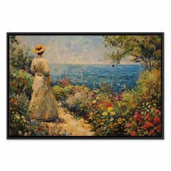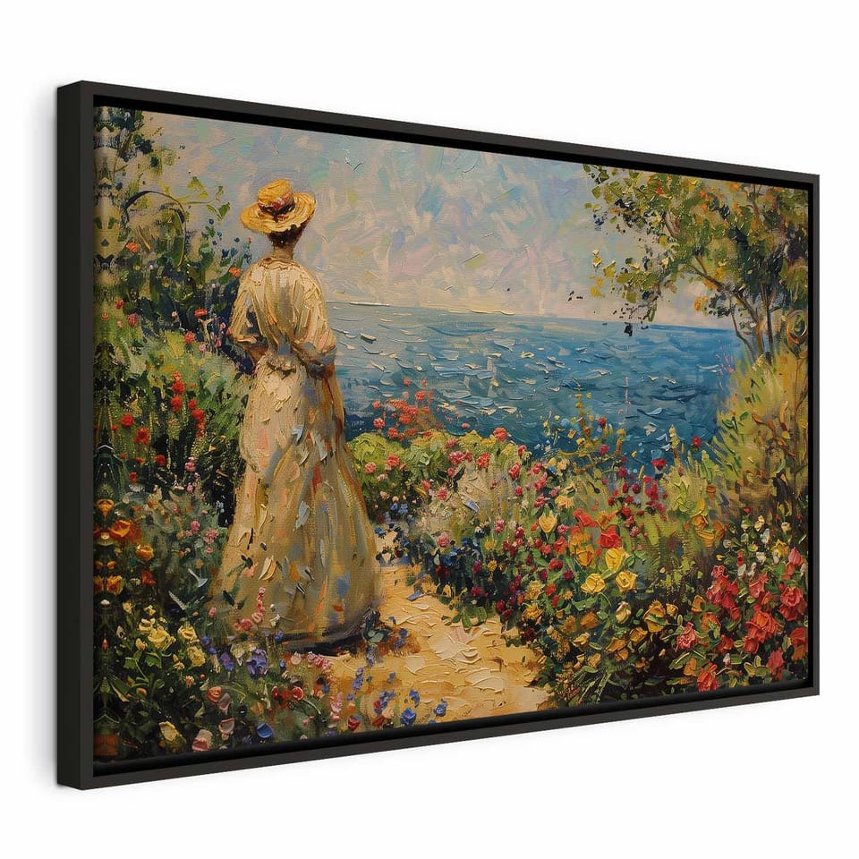 Obraz - Nostalgiczna impresja - zamyślona kobieta kontempluje krajobraz rozmiar 120x80, wykończenie W ramie drewnianej czarnej