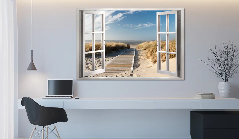 Obraz - Okno: widok na plażę rozmiar 30x20, wykończenie Standard