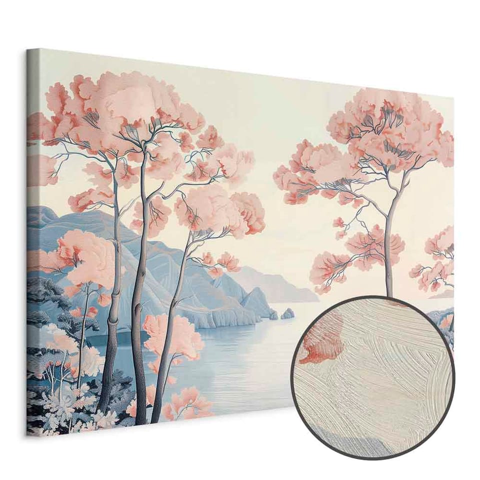 Obraz - Pejzaż z oceanem klifami i drzewami w delikatnych różowych barwach rozmiar 90x60, wykończenie Premium Print