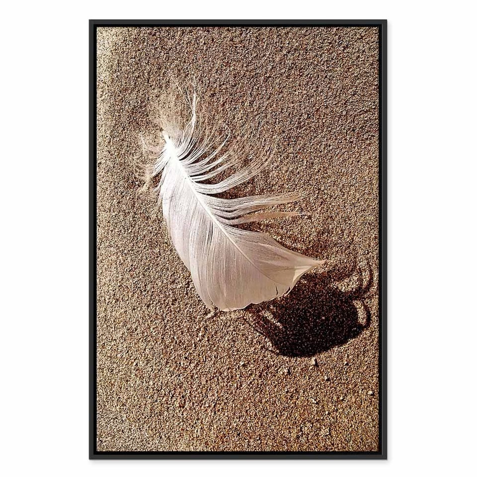 Obraz - Pióro na piasku (1-częściowy) pionowy rozmiar 60x90, wykończenie W ramie drewnianej czarnej