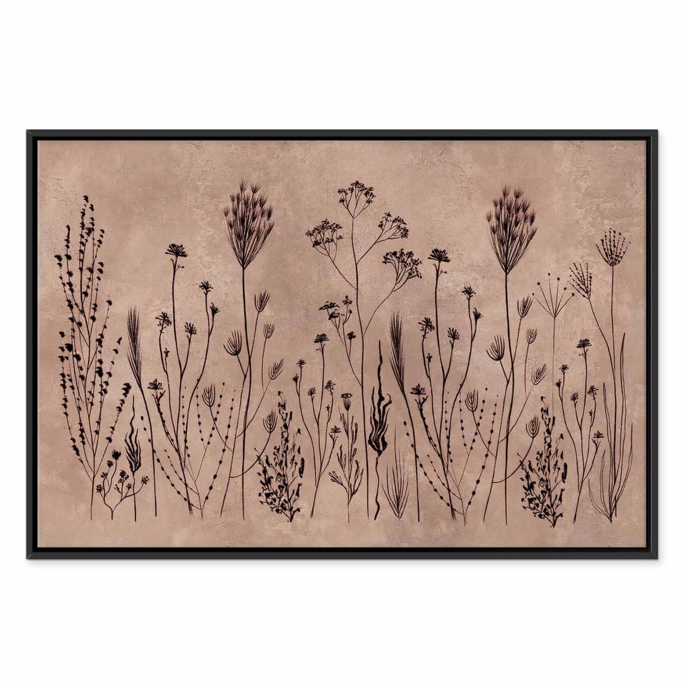 Obraz - Polne kwiaty - czarne rośliny na tle w technice lime wash rozmiar 120x80, wykończenie W ramie drewnianej czarnej